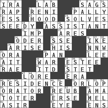 ACROSS 1. Lyricist Gershwin 4. Experiment locale 7. Droops 11. Hit sharply and swiftly 12. Painter Guido (1575-1642) 13. Chummy 14. Curvy letter 15. Parka part 16. Finds the solution 17. Full of seeds 19. Aide 21. Mischievous child 23. Ancient Greek god of war 24. Baltic tributary 25. Compass dir. 26. D.D.E's nickname 29. Ascend 30. Part of HMS, perhaps 31. Compass dir. 32. Mouth or opening 33. Baking dish 34. Area sheltered from the wind 35. Small island 36. Armed conflict 37. First name in cosmetics 40. Actress Charlotte 41. It would 42. Proofreading order 43. Old wives' tales, e.g. 45. Period 46. Home 51. Lowest deck of a ship 55. Speaker 56. Reuben's nickname 58. Wet nurse (var.) 59. Carrier 60. Celtic language 61. Cartoonist voice _ Blanc 62. SW Saudi Arabia district 63. Sight organ 64. Followers of ems DOWN 1. Angers 2. To erase 3. Domed church section 4. Lion 5. Small Philippine buffalo 6. Auction offers 7. Table seasonings 8. Inventor's middle name 9. Small, secluded valley 10. System (abbr.) 12. Poems 13. Airs 16. Founders of families 18. "You Light Up My Life" star Conn 20. Indian antelope 22. Before (prefix) 24. Speak pompously 25. Pottery fragment 26. An arm off of a larger body of water 27. Leg joint 28. She-sheep 29. Operatic vocal solo 32. Rowing implement 33. Eucharist need 36. One who wires 37. Compass dir. 38. Disco prop 39. Lacerate 43. 61 cubic inches 44. Scent 46. Roll call or roster of names 47. Greek god of love 48. Suttee (variant) 49. Algonquian 50. Suggestive of the supernatural 52. Unable to walk 53. Sign of something about to happen 54. Friends 57. Purpose