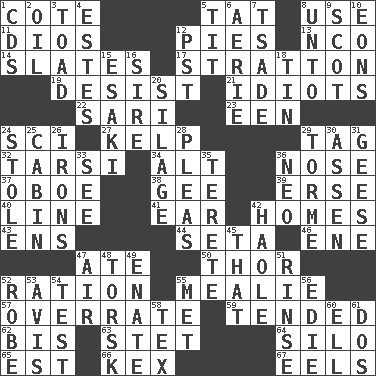 ACROSS 1. ____ d'Azur (French Riviera) 5. Make lace 8. Purpose 11. "Vaya con ____" 12. Sliced desserts 13. Non-commissioned officer (abbr.) 14. Chalkboards 17. Ski resort town in Vermont 19. Stop 21. Foolish or stupid persons 22. Indian skirt 23. Car or cant ending 24. _-fi 27. Seaweed 29. Label 32. Tarsus (plural) 34. Keyboard modifier key 36. Sense of smell 37. Mitch Miller's instrument 38. Turn to the right 39. Celtic language 40. Actor's bit 41. Hearing organ 42. Residences 43. Followers of ems 44. Stalk of a moss capsule 46. Compass dir. 47. Had dinner 50. Son of Odin 52. Food allowance for one day 55. Ear of corn 57. Make much ado about nothing 59. Looked after 62. Altar cloth linen 63. Proofreading order 64. Grain storage tower 65. Eastern Standard Time (abbr.) 66. A weed 67. Snakelike fish DOWN 1. Music discs 2. Lubricate 3. Frog relative 4. _____ Park, CO 5. Teat (slang) 6. Nest on high 7. Sadhe (variant) 8. To (old English) 9. Highlander 10. Immeasurably long periods of time 12. Pacific Standard Time (abbr.) 15. 1973 Nobel Price Winner (Physics) Leo 16. Father 18. Metal container 20. Fodder prepared in a silo 24. Fur scarf 25. Apartment or room in a ship 26. Removes the wrinkles 28. Entreaties 29. Singer Mel 30. NE Netherlands city 31. Honkers 33. Observe 35. Cigar-shaped 36. Modern: prefix 42. White Person, in Hawaii 45. Not this but _ 47. Wind 48. Cod relative 49. Maternal 51. Remove soap 52. Loose flowing garment 53. Opinion 54. Trial 55. Was introduced to 56. Singer Brickell 58. John Ritter's dad 60. Pipe bend 61. Two (Sp.)