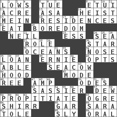 ACROSS 1. Moos 5. Third day of the wk. 8. Needle case 12. 43,560 square feet 13. White ___ sheet 14. Robbery 15. Count _ (2 wds.) 16. Dwellings 19. Erode 20. Mood resulting from idleness 21. Famous astronaut Armstrong 23. Curvy letter 24. Ocean 27. Hero or heavy, e.g. 30. Play the lead 31. Seas 34. Olfactory organ 35. Grant temporary use of 38. Bert's buddy 40. Chooses 41. Competent 42. Manatee 44. Parka part 45. Method 46. To separate or throw off 47. Electrical Unit 50. Lyric poems 53. More impudent 57. Morning condensation 59. Appease 63. Legendary monster 64. Bake eggs in their shells 65. Slender fish 66. "Two Mules for Sister ____" 67. Lacquered or enameled metalware 68. Roguish 69. Relating to the mouth DOWN 1. Unable to walk 2. Sea 3. Compose 4. Elected rep. 5. Pacific island yam 6. One who uses or employs something 7. Comfort 8. Car or cant ending 9. Nervous spasm 10. Purpose 11. It is 14. Folds over and sews together 17. Binary compound 18. Two (Sp.) 20. Group of countries in special alliance 22. Pressed 24. Close up, plug up 25. Compass direction 26. Ancient Greek god of war 28. Area sheltered from the wind 29. Hearing organs 30. Frozen precipiation fell 32. Compass dir. 33. Thailand, formerly 35. Cowardly lion portrayer 36. Mitch Miller's instrument 37. _ vera 39. Environmental prefix 43. Aroma 47. SW Saudi Arabia district 48. Floor protector 49. Air pressure measure (abbr.) 51. _ Allan Poe 52. Father Junipero _ 54. Sinks 55. Slanted text style (abbr.) 56. Suggestive of the supernatural 58. Welt 59. Pacific Standard Time (abbr.) 60. 17th letter of the Greek alphabet 61. Petroleum 62. Before (prefix) 63. Bear (Spanish)