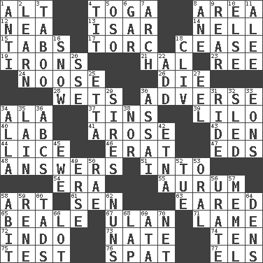ACROSS 1. Keyboard modifier key 4. Ancient Roman robe 8. Length times width 12. Teachers' org. 13. Austrian river, tributary to the Danube 14. 1994 drama film starring Jodie Foster 15. Bar bills 17. Torque (variant) 18. Desist 19. Removes the wrinkles 21. Actor Linden 23. To separate or throw off 24. Trap for birds or small mammals 26. Expire 28. Soaks 30. Contrary to your interests or welfare 34. In the manner of 37. Airtight sealed metal containers 39. _ and Stitch 40. Experiment locale 41. Came up 43. Lair 44. Louse (plural) 46. Part of Q.E.F. 47. Begley and Asner 48. Statements in reply to questions 51. To the inside or interior of 54. Epoch 55. Gold (Symbol: Au) 58. Tate display 61. Elected rep. 63. Having ears or earlike features 65. Calif. Air Force Base 67. ____ Bator 71. Unable to walk 72. Southeast Asian peninsula 73. Nathan's nickname 74. Nine, plus one 75. Trial 76. Petty quarrel 77. Raised railways DOWN 1. Opposed to 2. Acquire or gain knowledge or skills 3. Off limits 4. Teat (slang) 5. Bear (Spanish) 6. Slender fish 7. Bowlike part 8. One (Scot) 9. Bring up, as a child 10. Otherwise 11. Toward shelter 16. Overwhelm 18. 154 in Roman numerals 20. Compass dir. 22. Find the sum of 25. Singer James 27. Snakelike fish 29. Titles for men of rank and authority 30. Slender Brazilian palm 31. Travel on or in a vehicle 32. Downhill vehicle 33. Immeasurably long periods of time 34. Silent film actress Nazimova 35. (Had) reclined 36. Lettered men learn these first 38. Or not 42. Inactive volcano in Sicily 45. She-sheep 49. Celtic language 50. Actress Charlotte 52. Third day of the wk. 53. Of the mouth 56. A salt of uric acid 57. Klaipeda city 58. "This won't hurt ____!" 59. French philosopher Descartes 60. Small boys 62. Religious women 64. Habitations of wild animals 66. Car dealer's back yard 68. Infant locale 69. _ moment's notice (2 wds.) 70. Fish or hair follower