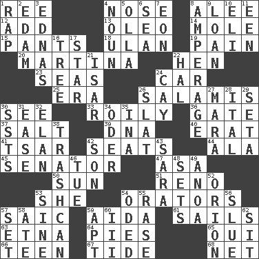 ACROSS 1. To sift 4. Characteristic smell of wine 8. Toward shelter 12. Say or write further 13. Margarine 14. Undercover agent 15. Leg coverings 18. ____ Bator 19. Ache 20. Chrissie's court nemesis 22. Layer 23. Oceans 24. Automobile 25. Epoch 26. Deli grouping 30. Perceive with the eye 33. Agitated, as a liquid 36. Yard entry 37. Table seasoning 39. Heredity factor (abbr.) 40. Part of Q.E.F. 41. Russian ruler of old 42. Theater features 44. In the manner of 45. Legislator 47. White ___ sheet 50. Player for Phoenix 51. Former U.S. Attorney General Janet 53. A female animal or person 54. Speakers 57. Ketch in the Levant 59. Opera by Verdi 61. Moves on water 63. Inactive volcano in Sicily 64. Sliced desserts 65. Fr. "Yes" 66. Adolescent 67. Event that recurs at intervals 68. Fish or hair follower DOWN 1. Strike 2. Dutch treat 3. Ferber et al. 4. Part of speech 5. Spanish pot 6. Ocean 7. Period of immesurable duration 8. Electrical Measurement 9. Grant temporary use of 10. Connecticut Ivy Leaguer 11. Car or cant ending 16. Family _ (genealogy) 17. Play the lead 21. Austrian river, tributary to the Danube 22. Actor Linden 24. Island 26. Narrow board 27. Hindu Mythology: god of death 28. Slanted text style (abbr.) 29. Stalk of a moss capsule 30. Fast planes 31. Relaxation 32. Flair 34. River in Europe 35. _ tizzy (2 wds.) 38. File 13 42. Boy, to dad 43. "Two Mules for Sister ____" 46. Third day of the wk. 48. Arranges properly for use 49. Small Philippine buffalo 52. Constellation of myth 53. Trig term 54. Wrote a lyric poem 55. Raze (variant) 56. Turn sharply 57. Arrange properly for use 58. Had dinner 59. Fitting 60. One more than two 62. Be seated