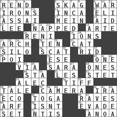 ACROSS 1. Tear apart 5. Heroin 9. Armed conflict 12. Metal shackles 14. South American Indian 15. Connecticut Ivy Leaguer 16. Slender Brazilian palm 17. Chow _ 18. Help 19. Area sheltered from the wind 20. Slept 23. Johnson of "Laugh-In" 24. Painter Guido (1575-1642) 25. Charged particles 27. Bowlike part 30. "___ Little Indians" 32. Feline 33. Grain storage tower 34. Jazz singing style 36. To free from 38. Luau course 39. Compass dir. 40. Single 43. By way of 46. "Two Mules for Sister ____" 48. Washington bills 49. R.R. building 51. French article 52. Proofreading order 53. Actor Baldwin 54. Small quarrel 56. Lie 58. Device for capturing images 61. Lyricist Gershwin 64. Environmental prefix 65. Ancient Roman robe 66. All-night dance parties 68. Sandy's bark 69. Is not 70. Dodge 71. Put into a specified state 72. Nuclear Threat Initiatives 73. Small Philippine buffalo DOWN 1. Monetary unit of Yemen 2. Celtic language 3. Characteristic smell of wine 4. Heredity factor (abbr.) 5. Simple or foolish person 6. Leg joint 7. Being or containing an acid 8. Separate the seeds from cotton 9. Puts on (as clothing) 10. Set down 11. Travel on or in a vehicle 13. Trig term 21. Pismires 22. Components 23. Against 24. 17th letter of the Greek alphabet 26. Rowing implement 27. Cleo's killer 28. River (Sp.) 29. 154 in Roman numerals 31. Rhinal 35. Cylindrical with tapered ends 37. Do not 41. Born 42. Eastern Standard Time (abbr.) 44. Capri or Wright 45. Had dinner 47. SW Saudi Arabia district 48. Order of Saint Francis (abbr.) 50. Buttonhole 53. At or to great height 55. Conductor's collection 56. Beverages made from leaves 57. 43,560 square feet 59. Hindu god of fire 60. Floor coverings 61. "Terrible" tsar 62. Do over again 63. Toward the sea 65. Shallow baking pan 67. Actress Gardner