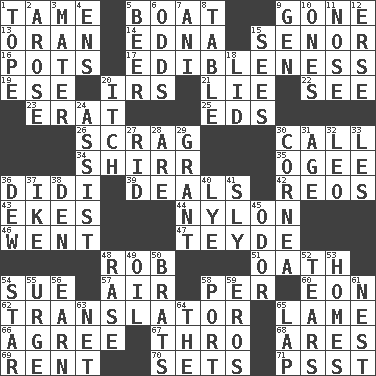ACROSS 1. Not wild 5. Water vessel 9. Went 13. NW Algerian seaport 14. Pulitzer Prize-winning author Ferber 15. Sir (Sp.) 16. Plant holders 17. The property of being fit to eat 19. Compass dir. 20. Big collection agency 21. Untruth 22. Observe 23. Part of Q.E.F. 25. Begley and Asner 26. Lean end of the neck 30. Give a ring to 34. Bake eggs in their shells 35. Double curve, resembling the letter S 36. "You Light Up My Life" star Conn 39. Allots cards 42. Vintage cars 43. Supplements with great effort 44. Thermoplastic polyamide 46. Gone 47. Miss Universe 1986, Barbara Palacios _ 48. Director Reiner 51. Pledge 54. Institute legal proceedings 57. Atmosphere 58. For each 60. A really long time 62. Interpreter 65. Unable to walk 66. Match 67. Through, poetically 68. Ancient Greek god of war 69. Monthly bill 70. Puts into a specified state 71. Inconspicuous attention getter DOWN 1. Drink excessively 2. Came up 3. Mother 4. Followers of ems 5. Fermented drink made from hops 6. Likelihood 7. Black tropical American cuckoo 8. Eating place 9. Commissioned mil. rank 10. Washington bills 11. Sense of smell 12. Celtic language 15. Perceives with the eye 18. Flaplike covering 20. Hankering 24. Aid 27. To free from 28. "We ___ not amused" (Victoria) 29. Monetary aid 30. Pupil covering 31. Personal question 32. Lion 33. French article 36. Morning condensation 37. D.D.E's nickname 38. Lair 40. Potassium hydroxide 41. Cunning 45. Aroma 48. Raze (variant) 49. Petroleum 50. Naughty children 52. Lacerates 53. Dwellings 54. Play the lead 55. Goad 56. Merit 58. Left side of a ship or aircraft 59. Greek god of love 61. A home for chicks 63. Fish or hair follower 64. Definite Article 65. Infant locale