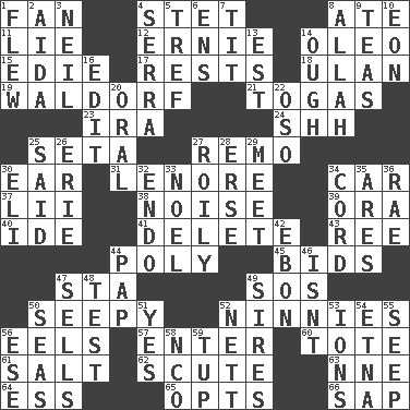 ACROSS 1. Avid follower 4. Proofreading order 8. Had dinner 11. Falsehood 12. Bert's buddy 14. Butter sub 15. Singer Brickell 17. Musical pauses 18. Uhlan (variant) 19. Apple salad 21. Ancient Roman robes 23. Lyricist Gershwin 24. Quiet! 25. Bristle 27. San ____ (Riviera town) 30. Hearing organ 31. Poe poem 34. Auto 37. Cards in a Roman deck? 38. Annoying sound 39. Mouth or opening 40. Binary compound 41. Keyboard key 43. Portuguese money of account (variant) 44. Many (prefix) 45. Auction offers 47. R.R. building 49. Mayday 50. Oozy 52. Fools 56. Snakelike fish 57. Keyboard key 60. Carry 61. Table seasoning 62. Snake scale 63. Compass dir. 64. Curvy letter 65. Elects 66. Plant excrement DOWN 1. Soared 2. Opera by Verdi 3. Famous astronaut Armstrong 4. Spanish missionary in California 5. Unclean, religiously 6. Followers of ems 7. Teat (slang) 8. Assad's deity 9. Afternoon social gatherings 10. Period of immesurable duration 13. Eastern Standard Time (abbr.) 14. Ending for "Through" and "Enough" 16. Prepare for publication 20. Taken by mouth 22. Bear (Spanish) 25. Stated 26. 4th largest of the Great Lakes 27. Agitated, as a liquid 28. Celtic language 29. Rendezvous 30. Connecticut Ivy Leaguer 32. Inside; within (prefix) 33. Christmas carol 34. Drawstring 35. Ancient Greek god of war 36. Actress Charlotte 42. Inky black, to poets 44. Infant food 46. Is not 47. Exchanges for money 48. Trial 49. Begets 50. Oceans 51. Affirmative reply 52. Remaining after all deductions 53. Charged particles 54. Inactive volcano in Sicily 55. Ooze 56. Compass dir. 58. Non-commissioned officer (abbr.) 59. Uncastrated adult male sheep