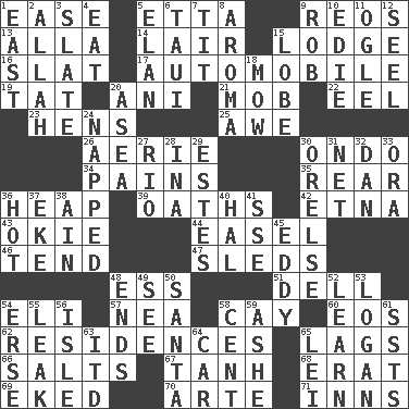 ACROSS 1. Relaxation 5. Singer James 9. Vintage cars 13. Silent film actress Nazimova 14. Den 15. Cabin 16. Narrow board 17. Form of transportation 19. Make lace 20. Black tropical American cuckoo 21. Crowd into 22. Snakelike fish 23. Coop moms 25. Deep reverence 26. Nest on high 30. Southwest Nigerian state 34. Aches 35. Rump 36. Pile 39. Expletives 42. Inactive volcano in Sicily 43. Migrant worker of the '30s 44. Artist's stand 46. Watch over 47. Bobsleighs 48. Curvy letter 51. Small valley 54. Biblical high priest 57. Teachers' org. 58. Island 60. Greek goddess of the dawn 62. Dwellings 65. Straggles 66. Table seasonings 67. Hyperbolic tangent 68. Part of Q.E.F. 69. Made supply last 70. Johnson of "Laugh-In" 71. Lodging establishments DOWN 1. 90 degrees 2. Assad's deity 3. Chalkboard 4. Erode 5. Liveliness 6. "Change" in Tahitian 7. Teat (slang) 8. Scent 9. Director Reiner 10. Singer Brickell 11. Stare 12. Stitch closed the eyes of (a falcon) 15. Ear part 18. Cut the grass 20. At sea 24. Slept 27. River (Sp.) 28. _ tizzy (2 wds.) 29. _____ Park, CO 30. Threatening words 31. Fish or hair follower 32. One of the 12 tribes of Israel 33. Mouth or opening 36. Being at a high temperature 37. Supplement with great effort 38. The 18th letter of the Arabic alphabet 40. Actor Linden 41. Compass dir. 45. Whirlpool 48. Extremities 49. Perceive with the eye 50. Before Barbara or Clara 52. Memorize 53. Utah city north of Ogden 54. Celtic language 55. Path through which fluid escapes 56. Small island 58. Penny 59. American tennis player Robert 61. Fast planes 63. It would 64. 4-wheeled motor vehicle 65. Luau accessory
