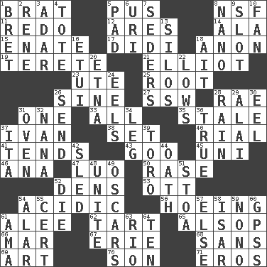 ACROSS 1. Naughty child 5. Suppuration 8. Science/research agcy. 11. Make new 12. Ancient Greek god of war 14. Chicken ___ king 15. Maternal 17. "You Light Up My Life" star Conn 18. Soon (poet.) 19. Cylindrical with tapered ends 21. American author Paul (1891-1958) 23. Shoshoni 25. Carrot, for example 26. Trig term 27. Compass dir. 28. Actress Charlotte 31. Single 33. 100% 35. Having lost freshness 37. "Terrible" tsar 38. Put into a specified state 40. Monetary unit of Yemen 41. Looks after 43. Thick or sticky substance 45. University (slang) 46. Santa ___, CA 47. Nilotic language 50. Raze (variant) 52. Cub Scout units 53. Baseball player Mel 54. Being or containing an acid 56. Cultivating 61. Toward shelter 62. Small pie 65. Columnist Joseph or Stewart 66. Spoil 67. 4th largest of the Great Lakes 68. Without 69. Nonscientific branch of learning 70. Boy, to dad 71. Greek god of love DOWN 1. Cy Young winner Saberhagen 2. French philosopher Descartes 3. The sixth month of the Jewish calendar 4. Carry 5. Groovy apt. 6. RI univ. 7. Spring feasts 8. Billionth: prefix 9. Narrow, elongated depression 10. Avid follower 13. Grain storage towers 16. Needle holder 18. Small island 20. Inactive volcano in Sicily 22. Coldest temperatures 24. Snakelike fish 26. Post 28. Water falling in drops from the sky 29. Mountain range southwest of Kyrgyzstan 30. Snakelike fish 31. Baking chamber 32. Grandmother 34. Part of a journey 36. Loyal 37. Call ___ day 39. "Corrida" creature 42. Downhill vehicle 44. Pledge 48. Join together 49. Motion picture awards 51. Portico 52. Expire 54. Having or resembling wings 55. Sure thing 57. Otherwise 58. Austrian river, tributary to the Danube 59. Words to Nanette 60. Global Positioning Systems (abbr.) 61. Nursemaid (var.) 63. _ de Janeiro 64. "___ Little Indians"