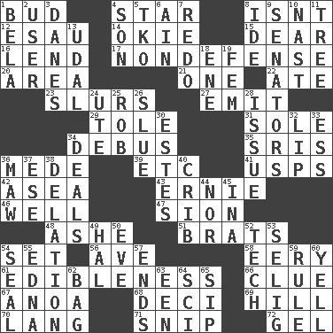 ACROSS 1. Partially opened flower 4. Play the lead 8. Is not 12. Son of Isaac 14. Migrant worker of the '30s 15. Letter starter 16. Grant temporary use of 17. Unrelated to defense, as in spending 20. Length times width 21. Single 22. Had dinner 23. Plays smoothly or legato 27. Give off 29. Lacquered or enameled metalware 31. Not divided or shared with others 34. To get out of a bus 35. Indian titles of respect 36. Ancient Persian 39. And so on (abbr.) 41. United States Postal Service (abbr.) 42. At sea 43. Bert's buddy 46. Not ill 47. The Jewish people; Israel 48. American tennis player Robert 51. Naughty children 54. Arrange properly for use 56. "___ Maria" 58. Suggestive of the supernatural 61. The property of being fit to eat 66. A slight indication 67. Small Philippine buffalo 68. Tenth: prefix 69. Land elevation 70. Long (Scottish) 71. Clip 72. Set DOWN 1. Actor Lugosi 2. One who makes use of a thing 3. Natives or inhabitants of Denmark 4. Boy, to dad 5. Ring climax 6. The 18th letter of the Arabic alphabet 7. Redecorate 8. Binary compound 9. Elected representatives 10. Political cartoonist Thomas 11. Relationship diagram 13. Allodial 18. Compass dir. 19. Opposite of masc. 24. Shoshoni 25. Director Reiner 26. Change direction abruptly 28. Come out of 30. _____ Park, CO 32. Mouth edge 33. Double-curved letter 34. Allots cards 36. Informal term for the mouth 37. Compass dir. 38. Conveyance 40. Baby bed with high sides 44. Or not 45. _ tizzy (2 wds.) 49. Actor Linden 50. Night before a holiday 52. Georgia ____ (Atlanta school) 53. Major League Baseball Commissioner Bud 54. Lick closed 55. Pulitzer Prize-winning author Ferber 57. Extremities 59. Court order 60. Shout 62. Container for groceries 63. Car or cant ending 64. _-fi 65. Small drink