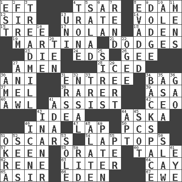 ACROSS 1. Lizard (obsolete) 4. Russian ruler of old 8. Dutch treat 12. Title for a knight 13. A salt of uric acid 14. Short-tailed, large-bodied rat 15. Woody plant 17. Pitcher Ryan 18. An important port of Yemen 19. Chrissie's court nemesis 21. Evades 23. Pass on 24. Begley and Asner 26. Turn to the right 27. So be it 28. On the rocks 30. Cuckoo 31. Main course 34. Paper or plastic container 37. Cartoonist voice _ Blanc 38. More valued for its uncommonness 39. White ___ sheet 40. Leather borer 41. Help 42. Corporate head (abbr.) 43. The main thing one is thinking about 44. "____ silly question..." 46. _ tizzy (2 wds.) 47. Pet locale 50. Personal Computers (abbr.) 51. Motion picture awards 54. Portable computers 57. Peachy ____! 58. Speak pompously 60. Lie 62. French philosopher Descartes 63. 61 cubic inches 64. Island 65. SW Saudi Arabia district 66. Paradise 67. She-sheep DOWN 1. Eastern Standard Time (abbr.) 2. Become taut 3. Excercise machine 4. Marketplace scale 5. First course 6. "One Day ___ Time" 7. Tear apart 8. Eluded 9. Evade 10. Toward shelter 11. Not women's 13. Single; one (prefix) 16. One of the Great Lakes 20. Nine, plus one 22. Double curve, resembling the letter S 25. Founders of families 27. Afresh 29. Certainty 30. Nanny (var.) 31. Celtic language 32. Relating to the nose 33. Three (prefix) 34. Keyboard key 35. At sea 36. E Mali city 41. The sixth month of the Jewish calendar 43. More lacking in sense or substance 44. Fitting 45. Native of Scotland 46. Ancient Celtic tribe of eastern Britain 48. Having winglike extensions 49. Eucharist need 51. Gumbo ingredient 52. Perceives with the eye 53. Flatfish 55. For each 56. Cole _ (cabbage dish) 59. To free from 61. Sight organ