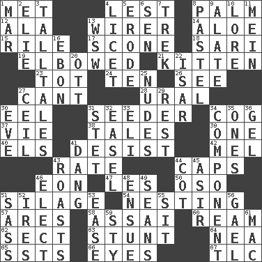 ACROSS 1. Was introduced to 4. For fear that 8. Inside of hand 12. Insect wing 13. One who wires 14. Medicinal plant 15. Cause heat under the collar 17. Biscuitlike quick bread 18. Indian skirt 19. Shoved, as through a crowd 21. Baby cat 23. Small child 24. "___ Little Indians" 26. Observe 27. Patter 28. Mountain range 30. Snakelike fish 31. Sowing specialist 34. Gear tooth 37. Compete 38. Stories 39. Single 40. Raised railways 41. Cease 42. Cartoonist voice _ Blanc 43. Assign a rank or rating to 44. Smile enhancers 46. A really long time 47. French article 50. Bear (Spanish) 51. Fodder prepared in a silo 54. Snuggling 57. Ancient Greek god of war 58. Slender Brazilian palm 60. 480, 500 or 516 sheets of paper 62. Religious group 63. Check the growth or development of 64. Teachers' org. 65. Fast planes 66. Sight organs 67. Affectionate concern, for short DOWN 1. Third mo. 2. Writer Wiesel 3. Baron Munchausen's specialties 4. It is permitted: Lat. 5. Eat (away) 6. Elected rep. 7. Long journey 8. Soft color 9. Having winglike extensions 10. Old wives' tales, e.g. 11. Chow _ 13. Compass dir. 16. Inky black, to poets 20. Baseball player Mel 22. Austrian river, tributary to the Danube 25. Unadorned figures 27. To provide with a ceiling 29. Repose 30. First lady 31. Proofreading order 32. Artist's stand 33. Connecticut Ivy Leaguer 34. Part 35. Singles 36. Set 41. Mild oath, euphamism for damn 43. Exposes to great heat 44. Small bed 45. SW Saudi Arabia district 46. Choose 48. Take place subsequently 49. Actors Connery and Penn 51. Backtalk 52. Angers 53. Comfort 55. Be seated 56. Highlander 59. Filthy place 61. Apple computer (short form)