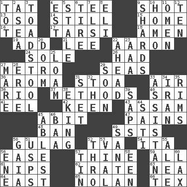 ACROSS 1. Make lace 4. First name in cosmetics 9. Guess 13. Bear (Spanish) 14. Not moving 15. Residence 16. Afternoon social gathering 17. Tarsus (plural) 18. So be it 19. Find the sum of 21. Area sheltered from the wind 22. Composer Copland 24. Not divided or shared with others 26. Possessed 27. Paris' subway 29. Oceans 30. Odor 31. Portico 33. Atmosphere 36. _ de Janeiro 37. Modes 40. _ Lanka 41. Snakelike fish 42. Peachy ____! 43. Indian state 45. "This won't hurt ____!" 47. Aches 48. Prohibit 49. Fast planes 50. Russian prison camp 52. Federal power corp. 54. Call ___ day 56. Relaxation 57. One or ones belonging to thee 59. 100% 61. Cuts off 62. Feeling or showing extreme anger 63. Teachers' org. 64. Compass direction 65. Pitcher Ryan 66. John Ritter's dad DOWN 1. Small child 2. Toward the sea 3. Inedible or poisonous agaric 4. Eastern Standard Time (abbr.) 5. Showing deterioration from age 6. Become fatigued 7. Otherwise 8. Biblical high priest 9. Broken pieces 10. Same (prefix) 11. Presage 12. "___ Little Indians" 20. Dormintory (informal) 22. At or in the front 23. Auto club (abbr.) 25. Rich soil 27. Female horse 28. 4th largest of the Great Lakes 29. Within a short period 31. Proofreading order 32. Definite Article 33. Aide 34. SW Asia republic 35. Basketball hoops 38. Supplementing with great effort 39. Plant excrements 44. Suttee (variant) 45. Most capable 46. Sound made by sheep 49. Before Barbara or Clara 50. Greek goddess of the earth (variant) 51. United States Postal Service (abbr.) 52. Through, poetically 53. Small bottle 55. Toward shelter 56. Compass dir. 57. Shallow baking pan 58. Car or cant ending 60. Not strict