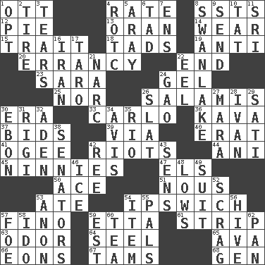 ACROSS 1. Baseball player Mel 4. Pace 8. Fast planes 12. Sliced dessert 13. NW Algerian seaport 14. Erode 15. Distinguishing feature 18. Bits 19. Against 20. Tendancy to err 22. Conclusion 23. "Two Mules for Sister ____" 24. Set 25. And not 26. Deli grouping 30. Epoch 33. Monte _, Las Vegas Hotel/Casino 36. Polynesian shrub of the pepper family 37. Auction offers 39. By way of 40. Part of Q.E.F. 41. Double curve, resembling the letter S 42. Disturbances 44. Cuckoo 45. Simpletons 47. Raised railways 50. Adept person 51. Horse sense 53. Had dinner 54. NE Massachusetts town 57. Fine (Spanish) 59. Singer James 61. Remove all contents or possession from 63. Aroma 64. Sew up the eyelids of hawks and falcons 65. Actress Gardner 66. Immeasurably long periods of time 67. Scottish caps 68. Commissioned mil. rank DOWN 1. Choose 2. Become fatigued 3. Rends 4. College mil. group 5. Like ___ of sunshine 6. Bit 7. Followers of ems 8. Tchaikovsky ballet 9. Post 10. Make lace 11. _ Lanka 16. SW Asia republic 17. Pacific island yam 21. Drug cop 22. Snakelike fish 24. E Mali city 26. Narrow board 27. Hindu Mythology: god of death 28. "Terrible" tsar 29. Suttee (variant) 30. Inky black, to poets 31. Swiss mountan, "Queen of the Mountains" 32. Arabian gulf 34. Opinion 35. River (Sp.) 38. Legislators 42. To separate or throw off 43. Elected reps. 46. Frozen water 48. Moos 49. Set or collection 52. Lean end of the neck 53. At once, immediately (arch.) 54. Detail 55. Friends 56. Hub of activity 57. Enemy 58. Wedding promise 59. Eastern Standard Time (abbr.) 60. Afternoon social gathering 62. Baking dish