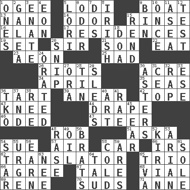 ACROSS 1. Double curve, resembling the letter S 5. Farming town in central California 9. Water vessel 13. Billionth: prefix 14. Aroma 15. Remove soap 16. Liveliness 17. Dwellings 19. Put into a specified state 20. Title for a knight 21. Manchild 22. Ingest 23. A really long time 25. Possessed 26. Debaucheries 30. Measure of real estate 34. Showery time 35. Oceans 36. Small pie 39. Approach 42. Drink excessively 43. Leg joint 44. Window treatment 46. Wrote a lyric poem 47. Bull 48. Director Reiner 51. "____ silly question..." 54. Institute legal proceedings 57. Atmosphere 58. Auto 60. Big collection agency 62. Interpreter 65. Musical group of three 66. Match 67. Story 68. Small bottle 69. French philosopher Descartes 70. Beer foam 71. Singer Murray DOWN 1. Washington bills 2. An organ shaped like a helmet 3. Related on the mother's side 4. Age 5. Australian parrot (variant) 6. Baltic tributary 7. Two (Sp.) 8. From or relating to Ireland 9. Storage container 10. Single time 11. At sea 12. Trial 15. Tear apart 18. ___ good deed 20. Sever or remove by pinching or nipping 24. Spoke pompously 27. Mouth or opening 28. Shallow baking pan 29. Bobsleighs 30. Michaelmas daisies 31. Corporate head (abbr.) 32. Strike 33. Compass dir. 36. Ring climax 37. Plus 38. To riddle 40. Nonscientific branch of learning 41. Actress Charlotte 45. Lightbulb-shaped fruit 48. Raze (variant) 49. Petroleum 50. Naughty children 52. Japanese brewing company 53. Believer in; advocate of (suffix) 54. Play the lead 55. Goad 56. Merit 58. Having a low temperature 59. Ancient Greek god of war 61. Flatfish 63. Born 64. The 19th letter of the Greek alphabet 65. Federal power corp.