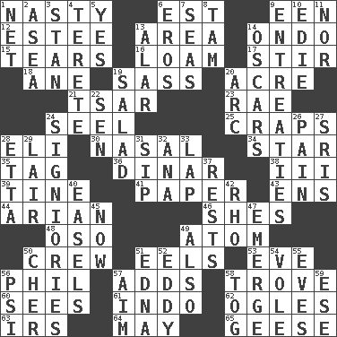 ACROSS 1. Smutty 6. Eastern Standard Time (abbr.) 9. Car or cant ending 12. First name in cosmetics 13. Type of rug 14. Southwest Nigerian state 15. Pulls apart 16. Rich soil 17. Commotion 18. One (Scot) 19. Backtalk 20. Measure of real estate 21. Russian ruler of old 23. Actress Charlotte 24. Sew up the eyelids of hawks and falcons 25. Dice game 28. Connecticut Ivy Leaguer 30. Rhinal 34. Play the lead 35. Label 36. Middle Eastern gold or silver currency 38. One more than two 39. Prong on a fork 41. Some stationery 43. Followers of ems 44. Believer in; advocate of (suffix) 46. "______ My Girl" (Turtles hit) 48. Bear (Spanish) 49. Smallest unit of an element 50. Group working together 51. Snakelike fish 53. Night before a holiday 56. Silvers or Donahue 57. Does sums 58. Collection of objects 60. Observes 61. _ china 62. Stares at amorously 63. Big collection agency 64. Fifth month 65. Honkers DOWN 1. Fish or hair follower 2. Toward the sea 3. Comedian Laurel of Laurel & Hardy 4. Cylindrical with tapered ends 5. Consenting reply 6. Greek god of love 7. Oceans 8. Scottish cap 9. Pleas 10. Singer Brickell 11. Not either 13. Having or resembling wings 14. Motion picture awards 19. First course 20. Curve 22. Elected rep. 24. Seigniories (variant) 26. Ache 27. Indian titles of respect 28. Singer James 29. Den 31. Small drink 32. Santa ___, CA 33. Infant locale 37. Musical pauses 40. Artist's stands 42. 17th letter of the Greek alphabet 45. Immediately 47. Develop 49. In addition 50. "Mermaids" star 51. Pulitzer Prize-winning author Ferber 52. Whirlpool 54. Short-tailed, large-bodied rat 55. Nights before holidays 56. Air pressure measure (abbr.) 57. Direct toward a target or goal 58. Coat; cloak 59. Compass dir.