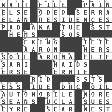 ACROSS 1. Electrical Unit 5. Do some clerical work 9. Ache 13. Otherwise 14. Wrote a lyric poem 15. Father Junipero _ 16. Liveliness 17. Dwellings 19. Groovy apt. 20. Alias (abbr.) 21. Third day of the wk. 22. Fast jet (abbr.) 23. Folds over and sews together 25. Mayday 26. Supplementing with great effort 30. Wig 34. Composer Copland 35. Possessive pronoun 36. Earth 39. Odor 42. Writer Wiesel 43. Indian skirt 44. Women servants 46. Celtic language 47. Bert's buddy 48. To free from 51. Fast planes 54. Double-curved letter 57. Binary compound 58. The grampus (Milton) 60. Petroleum 62. Form of transportation 65. Had on 66. Actors Connery and Penn 67. Southern CA. univ. 68. Takes to court 69. Jane of fiction 70. Dry up 71. Compass direction DOWN 1. Shed a tear 2. Assad's deity 3. Sadhe (variant) 4. "___ Little Indians" 5. Tined utensil 6. The main thing one is thinking about 7. French article 8. Prepares for publication 9. Animal enclosure 10. Arches 11. Angers 12. Political cartoonist Thomas 15. Perceives with the eye 18. Superhero pair 20. "____ silly question..." 24. Ear of corn 27. Retirement account (abbr.) 28. Or not 29. Dwarf 30. College papers 31. Snakelike fish 32. Three (prefix) 33. Compass dir. 36. Compass dir. 37. Boat paddle 38. Big collection agency 40. Impair 41. The 18th letter of the Arabic alphabet 45. Flat circle 48. Basketball hoops 49. Wedding promise 50. Alight from a bus 52. Woman's close-fitting hat 53. Male parents of animals 54. Comfort 55. Chop _ 56. Play the lead 58. Water jar 59. Bring up, as a child 61. For fear that 63. Single 64. Frozen water 65. Compass dir.