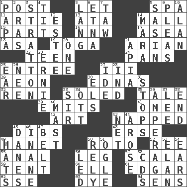 ACROSS 1. Mail 5. Allow 8. Health resort 11. Nick name for Arthur 13. "One Day ___ Time" 14. Promenade 15. Pieces 16. Compass dir. 17. Toward the sea 18. White ___ sheet 19. Ancient Roman robe 21. Believer in; advocate of (suffix) 22. Adolescent 24. Baking dishes 25. Main course 27. One more than two 29. A really long time 30. Ferber et al. 32. Painter Guido (1575-1642) 33. Having a sole or soles 35. Falsehood 39. Sends forth 41. Sign of something about to happen 42. Nonscientific branch of learning 43. Slept 45. Claim 48. Celtic language 49. French painter Edouard 50. Printing process, for short 52. To sift 55. Of or related to the anus 56. Part of a journey 57. Any of the three canals of the cochlea 59. Portable shelter 60. Pipe bend 61. _ Allan Poe 62. Compass dir. 63. Color 64. Elected reps. DOWN 1. Dad 2. Mouths or openings 3. Ski resort town in Vermont 4. Teat (slang) 5. Long (Scottish) 6. Inactive volcano in Sicily 7. The 23rd letter of the Hebrew alphabet 8. Indian antelope 9. Entreaties 10. ____ Jay Lerner 12. First name in cosmetics 14. Hindu Mythology: god of death 20. Single 21. Capital of Western Samoa 23. Bert's buddy 25. Hearing organ 26. Born 27. Binary compound 28. Indiana (abbr.) 30. Raised railways 31. Closes up, plugs up 33. Title for a knight 34. Baseball player Mel 36. Electrical Measurement 37. Area sheltered from the wind 38. Conclusion 40. Vertical spar for supporting sails 43. Fish or hair follower 44. Came up 45. Natives or inhabitants of Denmark 46. Empty; void 47. Waist strap 49. Floor coverings 50. Have confidence or faith in 51. Stare at amorously 53. Liveliness 54. Hearing organs 56. Directed 58. Music discs