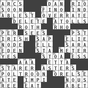 ACROSS 1. Curves 5. One of the 12 tribes of Israel 8. _ de Janeiro 11. Within a short period 12. A pale, very dry sherry 13. Indiana (abbr.) 14. Most capable 17. Make much ado about nothing 19. Erase 21. Ringlike coral islands and reefs 22. Writer of Portnoy's Complaint (1969) 23. 17th letter of the Greek alphabet 24. For each 27. Observes 29. Pacific Standard Time (abbr.) 32. From or relating to Ireland 34. Plant excrement 36. Writer Wiesel 37. Connecting point 38. Pipe bend 39. "Two Mules for Sister ____" 40. Genesis locale 41. R.R. building 42. Distance measurement 43. Consenting reply 44. Portico 46. Curvy letter 47. American Automobile Association (abbr.) 50. Singer James 52. A viewer who gazes fixedly 55. Michaelmas daisies 57. Characterized by complete cowardliness 59. Threatening words 62. Had dinner 63. Body of Kaffir warriors 64. Good sense 65. To separate or throw off 66. Consume 67. Collude with DOWN 1. White ___ sheet 2. Director Reiner 3. Having a low temperature 4. Contemptuous expression 5. HTML Container Element 6. Approach 7. 0 degrees 8. Monetary unit of Yemen 9. International (abbr.) 10. Lyric poems 12. Enemy 15. Agitate, as a liquid 16. Wig 18. Friend of Pooh 20. College papers 24. Abounding in pines 25. Eat (away) 26. Amusement-park features 28. Table seasonings 29. Food holder 30. Titles for men of rank and authority 31. Rends 33. Elected rep. 35. Food holders 36. Compass dir. 42. Mother 45. "Beetle Bailey" pooch 47. Tate display 48. Nest on high 49. Odor 51. Sports stadium 52. Coast Guard woman 53. Haul 54. Toward shelter 55. Cuckoo 56. Messy guy 58. Choose 60. Institute legal proceedings 61. Eastern Standard Time (abbr.)