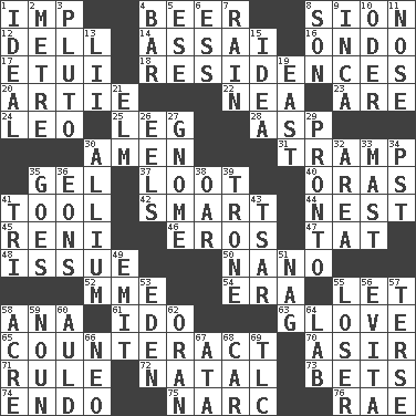 ACROSS 1. Naughty child 4. Fermented drink made from hops 8. The Jewish people; Israel 12. Small valley 14. Slender Brazilian palm 16. Southwest Nigerian state 17. Needle holder 18. Homes 20. Nick name for Arthur 22. Teachers' org. 23. "We ___ not amused" (Victoria) 24. Lion 25. Part of a journey 28. Viper 30. So be it 31. _____ steamer (cargo ship) 35. Set 37. Plunder 40. Mouths or openings 41. Implement 42. Don Adams' spy role 44. Egg locale 45. Painter Guido (1575-1642) 46. Greek god of love 47. Make lace 48. Come out of 50. Billionth: prefix 52. Madame (abbr.) 54. Period 55. Allow 58. Santa ___, CA 61. Wedding promise 63. Michael Jackson trademark 65. Neutralize 70. SW Saudi Arabia district 71. Governing power 72. Relating to or accompanying birth 73. Wagers 74. Inside; within (prefix) 75. Drug cop 76. Actress Charlotte DOWN 1. Perfect 2. Distance measurement (Brit.) 3. Mickey's pet 4. Long, evenly shaped piece 5. Compass dir. 6. Curvy letter 7. Water falling in drops from the sky 8. Male offspring 9. South American Indian 10. Baltic tributary 11. Characteristic smell of wine 13. Cards in a Roman deck? 15. The main thing one is thinking about 19. 90 degrees 21. Shade tree 26. Snakelike fish 27. Dwarf 29. Right away 30. Plant genus of onion and garlic 32. Type of rug 33. Vertical spar for supporting sails 34. Pacific Standard Time (abbr.) 35. Travels 36. Immeasurably long periods of time 38. Rowing implement 39. Heavy duty weighing machine 41. Three (prefix) 43. Russian ruler of old 49. Send forth 51. Tired old horse 53. Genesis locale 55. Failure 56. Webber/Rice musical 57. Laconic 58. 43,560 square feet 59. Part of speech 60. Old (Scot.) 62. NW Algerian seaport 64. Experiment locale 66. Modern: prefix 67. _ moment's notice (2 wds.) 68. Auto 69. Affectionate concern, for short