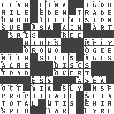 ACROSS 1. Flair 5. Pale green bean 9. Russian composer Stravinsky 13. Cause heat under the collar 14. Locale of original sin 15. Swap 16. Southwest Nigerian state 17. Boob tube 19. Take to court 20. White ___ sheet 21. The 18th letter of the Arabic alphabet 22. Tate display 23. Indian titles of respect 25. Portuguese money of account (variant) 26. Amusement-park features 30. Have trust in 34. U. of Maine site 35. Double curve, resembling the letter S 36. Chow _ 39. Makes a sale 42. Ripens 43. 1/640 square mile 44. Plates 46. Frog relative 47. Unconcealed 48. Double-curved letter 51. Toward the sea 54. Sep. follower 57. By way of 58. Wily 60. Science/research agcy. 62. Conciliate 65. Bristle 66. "_____ Recall" 67. Nuclear Threat Initiatives 68. Independent ruler or chieftain 69. Hurried 70. Small pie 71. Jane of fiction DOWN 1. Greek god of love 2. "_ and Lucy" (Charlie Brown theme song) 3. Tree or shrub in the Birch family 4. Modern: prefix 5. Allows 6. The content of cognition 7. Cartoonist voice _ Blanc 8. Approach 9. Big collection agency 10. Greek goddess of the earth (variant) 11. Scent 12. Monthly bill 15. Prong on a fork 18. Compete 20. SW Saudi Arabia district 24. Pressed 27. Two (Sp.) 28. Compass dir. 29. Twentieth part of a lira 30. Cooks with dry heat, as in an oven 31. Oval reproductive body of a fowl 32. Area sheltered from the wind 33. Affirmative reply 36. Floor protector 37. Environmental prefix 38. Retirement account (abbr.) 40. 54 in ancient Rome 41. Compass dir. 45. Supercomputer manufacturer 48. Tending to cause great harm 49. Be seated 50. Inhabitant of Heaven 52. Foe 53. Having gotten out of bed 54. Chooses 55. Riding implement 56. Carryall 58. Use a spoon 59. For fear that 61. Conductor's collection 63. Writing tablet 64. _ moment's notice (2 wds.) 65. Perceive with the eye