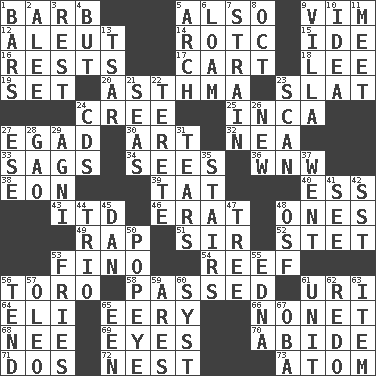 ACROSS 1. Sharp remark 5. In addition 9. Zeal 12. Eskimo relative 14. College mil. group 15. Binary compound 16. Musical pauses 17. Heavy open wagon 18. Area sheltered from the wind 19. Put into a specified state 20. Respiratory problem 23. Narrow board 24. Algonquian 25. South American Indian 27. Mild oath 30. Nonscientific branch of learning 32. Teachers' org. 33. Droops 34. Observes 36. Compass dir. 38. Age 39. Make lace 40. Double-curved letter 43. It would 46. Part of Q.E.F. 48. Washington bills 49. Hit sharply and swiftly 51. Title for a knight 52. Proofreading order 53. A pale, very dry sherry 54. Coral collection 56. "Corrida" creature 58. Went by 61. RI univ. 64. Biblical high priest 65. Suggestive of the supernatural 66. Music written for nine 68. Born 69. Sight organs 70. Tolerate 71. Two (Sp.) 72. A home for chicks 73. Smallest unit of an element DOWN 1. Long, evenly shaped pieces 2. Toward shelter 3. Relief 4. Yet 5. Bowlike part 6. Rich soil 7. Put through a sieve 8. Sep. follower 9. Country estate 10. It may be bright or harebrained 11. Confront 13. Russian ruler of old 21. Oceans 22. Cigar-shaped 23. Glance over 24. Music discs 26. ___ Haven, CT 27. Compass dir. 28. E Mali city 29. Hindu god of fire 31. Lacerates 35. Flight of steps 37. Gone 41. Observe 42. Fast jet (abbr.) 44. Musical group of three 45. One of the 12 tribes of Israel 47. Woody plant 48. Order of Saint Francis (abbr.) 50. Wimpy's pal 53. Strips of potato fried in deep fat 55. Pulitzer Prize-winning author Ferber 56. Be inclined (to) 57. Margarine 59. Ancient Greek god of war 60. System (abbr.) 61. A single undivided whole 62. Redecorate 63. A distinct part 65. Car or cant ending 67. Chief or king in Benin or Nigeria