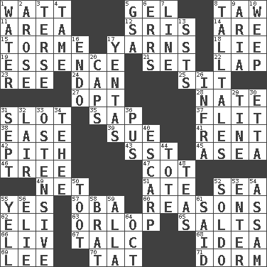 ACROSS 1. Electrical Unit 5. Set 8. The 23rd letter of the Hebrew alphabet 11. Type of rug 12. Indian titles of respect 14. "We ___ not amused" (Victoria) 15. Singer Mel 17. Tall tales 18. Whopper 19. Core 21. Arrange properly for use 22. Pet locale 23. To riddle 24. One of the 12 tribes of Israel 25. Be seated 27. Elect 28. Nathan's nickname 31. Position in a hierarchy or organization 35. Plant excrement 37. Secret move to avoid paying debts 38. Relaxation 39. Take to court 41. Monthly bill 42. Essential or central part 43. Fast jet (abbr.) 45. At sea 46. Family _ (genealogy) 47. Small bed 49. Fish or hair follower 51. Had dinner 52. Ocean 55. Affirmative reply 57. Chief or king in Benin or Nigeria 60. Thinks logically 62. Biblical high priest 63. Fourth or lowest deck 65. Table seasonings 66. 54 in ancient Rome 67. Baby powder 68. The content of cognition 69. Area sheltered from the wind 70. Make lace 71. Dormintory (informal) DOWN 1. Wetness 2. Came up 3. Laconic 4. Docile 5. Girls' org. (abbr.) 6. Blunders 7. Actor's bit 8. Baron Munchausen's specialties 9. Operatic vocal solo 10. Shed a tear 13. Fast planes 16. Inside; within (prefix) 17. Gossips 20. Balmoral and tarboosh 26. Kind of red light 29. Prong on a fork 30. Singer James 31. Back-to-school mo. 32. Den 33. Clearly or manifestly demonstrative 34. Giggle 36. Ichor 40. Fortification 44. Carryall 48. Afternoon social gatherings 50. A blast of a horn 52. Twentieth part of a lira 53. Keyboard key 54. Indian state 55. Shout 56. Writer Wiesel 58. Naughty child 59. Silent film actress Nazimova 61. Expressed in words 64. Sep. follower