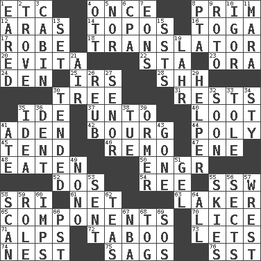 ACROSS 1. And so on (abbr.) 4. At one time in the past 8. Demure 12. Caspian sea tributary 14. Literary convention 16. Ancient Roman robe 17. Loose flowing garment 18. Interpreter 20. Webber/Rice musical 22. R.R. building 23. Mouth or opening 24. Lair 25. Big collection agency 28. Quiet! 30. Woody plant 31. Musical pauses 35. Binary compound 37. To (old English) 40. Plunder 41. Arabian gulf 42. French market town 44. More than one (prefix) 45. Look after 46. San ____ (Riviera town) 47. Compass dir. 48. Eroded 50. Engineer (abbr.) 52. Two (Sp.) 54. To sift 55. Compass dir. 58. _ Lanka 61. Fish or hair follower 63. Member of a famous L.A. basketball team 65. Pieces 70. Louse (plural) 71. High mountains 72. Off limits 73. Allows 74. Egg locale 75. Settles 76. Fast jet (abbr.) DOWN 1. Having ears or earlike features 2. Collection of objects 3. Apartment or room in a ship 4. Baseball player Mel 5. And not 6. Accounting whiz (abbr.) 7. Immeasurably long periods of time 8. Parent Teacher Association (abbr.) 9. Printing process, for short 10. Russian composer Stravinsky 11. Hindu Mythology: god of death 13. Arrange properly for use 15. Fast planes 19. Cowardly lion portrayer 21. Wind 26. Reuben's nickname 27. Sir (Sp.) 29. Aide 30. Looked after 32. Within a short period 33. Lacquered or enameled metalware 34. Filthy place 35. The content of cognition 36. Gouge 38. Third day of the wk. 39. Channel Islands abalone 41. Had dinner 43. Went 49. Words to Nanette 51. Set 53. Posted 55. Atmospheres 56. Religious groups 57. Obtain by seizing forcibly or violently 58. Glance over 59. Hero or heavy, e.g. 60. Naughty children 62. Afternoon social gatherings 64. Everything 66. Pacific Standard Time (abbr.) 67. Basketball assoc. 68. Coat; cloak 69. Distress signal