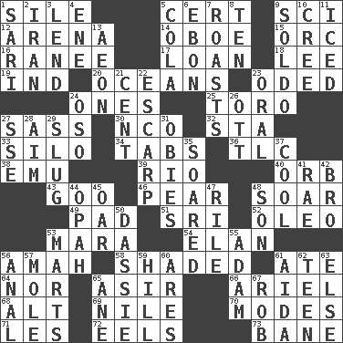 ACROSS 1. Filth; sediment 5. Certainty 9. _-fi 12. Sports stadium 14. Mitch Miller's instrument 15. The grampus (Milton) 16. The wife of a rajah (variant) 17. Grant temporary use of 18. Area sheltered from the wind 19. Working for oneself (abbr.) 20. Seas 23. Wrote a lyric poem 24. Singles 25. "Corrida" creature 27. Backtalk 30. Non-commissioned officer (abbr.) 32. R.R. building 33. Grain storage tower 34. Bar bills 36. Affectionate concern, for short 38. Australian flightless bird 39. _ de Janeiro 40. Globe 43. Thick or sticky substance 46. Lightbulb-shaped fruit 48. Fly high 49. Writing tablet 51. _ Lanka 52. Butter sub 53. Hindu Mythology: god of death 54. Enthusiasm 56. Wet nurse 58. Cast a shadow over 61. Had dinner 64. Or not 65. SW Saudi Arabia district 66. Satellite of Uranus 68. Keyboard modifier key 69. Mediterranean tributary 70. Methods 71. French article 72. Snakelike fish 73. Object of repulsion DOWN 1. Indian skirt 2. SW Asia republic 3. Grant temporary use of 4. Compass dir. 5. Root beer relative 6. Inky black, to poets 7. Exposes to great heat 8. "___ Little Indians" 9. Twentieth part of a lira 10. Algonquian 11. On the rocks 13. Age 21. Penny 22. Fortification 23. Taken by mouth 24. Bear (Spanish) 26. Baseball player Mel 27. Compass dir. 28. Direct toward a target or goal 29. Strike heavily 31. Off-Broadway awards 35. Flew 37. Calm and collected 41. Actress Charlotte 42. Sis' sibling 44. Brightly colored fish 45. Boat paddle 47. Cause heat under the collar 48. Manchild 50. Small ungulate mammals of Africa 53. Shops 55. First of billions? 56. Of or related to the anus 57. Undercover agent 59. Land elevation 60. Ancient Greek god of war 61. Opera by Verdi 62. Adolescent 63. Otherwise 65. One (Scot) 67. Director Reiner