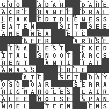 ACROSS 1. Thick or sticky substance 4. The sixth month of the Jewish calendar 8. Have the gumption 12. 43,560 square feet 14. Indian princess (variant) 16. Relating to the mouth 17. Path through which fluid escapes 18. The property of being fit to eat 20. Eroded 22. Be seated 23. Observe 24. A saturated hydrocarbon 25. Teachers' org. 28. And so on (abbr.) 30. Fermented drink made from hops 31. Came up 35. _ tizzy (2 wds.) 37. For fear that 40. Made supply last 41. Slanted text style (abbr.) 42. Snob 44. Arches 45. Monthly bill 46. Opposed to 47. Make lace 48. Collect or gather 50. 4th largest of the Great Lakes 52. Had dinner 54. Arrange properly for use 55. 24 hours 58. Bear (Spanish) 61. Boat paddle 63. Father Junipero _ 65. Complicated, petty procedures 70. Den 71. Toward shelter 72. Annoying sound 73. Connect, as a bridge 74. Christmas carol 75. Adolescent 76. Followers of ems DOWN 1. An organ shaped like a helmet 2. Sea 3. Speak pompously 4. "We ___ not amused" (Victoria) 5. June honoree 6. Black tropical American cuckoo 7. Confederate soldiers (slang) 8. Spanish title 9. Ancient Greek god of war 10. Raze (variant) 11. Otherwise 13. Make supply last 15. Writer Wiesel 19. Singer James 21. Compass dir. 26. Snakelike fish 27. Sports stadium 29. Cause to be 30. Greek mezzo-soprano Agnes 32. Gumbo ingredient 33. Religious group 34. Begley and Asner 35. A whole individual unit 36. Grandmother 38. Manchild 39. Lugs 41. Retirement account (abbr.) 43. Become fatigued 49. Portico 51. It is 53. Merit 55. Window treatment 56. Believer in; advocate of (suffix) 57. Entertaining tales 58. Northwest Algerian city 59. Grain storage tower 60. Double curve, resembling the letter S 62. Carrot, for example 64. Raised railways 66. Cartoonist voice _ Blanc 67. Falsehood 68. Compass dir. 69. Elected rep.