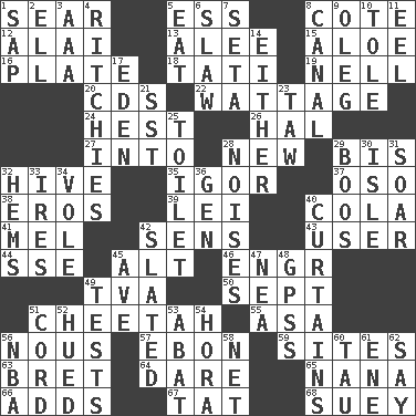 ACROSS 1. Singe 5. Curvy letter 8. ____ d'Azur (French Riviera) 12. Jai ____ 13. Toward shelter 15. _ vera 16. Food holder 18. Jacques of French films 19. 1994 drama film starring Jodie Foster 20. Music discs 22. Electrical Measurement 24. Command 26. Actor Linden 27. To the inside or interior of 28. ___ Haven, CT 29. Twice 32. Hub of activity 35. Composer Stravinsky 37. Bear (Spanish) 38. Greek god of love 39. Flowery wreath 40. Root beer relative 41. Cartoonist voice _ Blanc 42. Elected reps. 43. One who uses or employs something 44. Compass dir. 45. Keyboard modifier key 46. Engineer (abbr.) 49. Federal power corp. 50. Back-to-school mo. 51. Leopard's kin 55. White ___ sheet 56. Common sense 57. Inky black, to poets 59. Locates 63. Cy Young winner Saberhagen 64. Have the gumption 65. Nanny 66. Does sums 67. Make lace 68. Chop _ DOWN 1. Plant excrement 2. Pipe bend 3. Auto club (abbr.) 4. Actors Guy, Robert Welles, and Clint 5. Erode 6. Cole _ (cabbage dish) 7. Stalk of a moss capsule 8. Lessep's creation 9. Cassini of fashion 10. Lacquered or enameled metalware 11. Snakelike fish 14. One or the other of two 17. Paradise 21. Fast jet (abbr.) 23. The 23rd letter of the Hebrew alphabet 25. Bathroom 28. Annoying sounds 29. Expressions of contempt or scorn 30. Small island 31. Fly high 32. Equivocates 33. Angers 34. Short-tailed, large-bodied rat 36. Commissioned mil. rank 40. Window treatments 42. Scheduled 45. "___ Maria" 47. Teachers' org. 48. Global Positioning Systems (abbr.) 49. Trials 51. Drawstring 52. Took on color 53. Blind as ____ 54. Israeli folk dance 56. Basketball assoc. 58. Fish or hair follower 60. The 19th letter of the Greek alphabet 61. Compass dir. 62. Declare