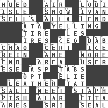 ACROSS 1. Took on color 5. Wind 8. Farming town in central California 12. Small island 13. Overwhelm 15. _ the terrible 16. Makes a sale 18. Silent film actress Nazimova 19. Grant temporary use of 20. _ moment's notice (2 wds.) 22. Crying or shouting loudly 24. Hoop that covers a wheel 26. French article 27. Angers 28. Corporate head (abbr.) 29. Apply (a substance) by light strokes 32. US Secretary of Labor Elaine L. _ 35. An absolute certainty 37. Frozen water 38. It's straight from the horse's mouth 39. A saturated hydrocarbon 40. Greater amount 41. Conclusion 42. Type of rug 43. One who uses or employs something 44. Compass dir. 45. Viper 46. Bar bills 49. Choose 50. Writer Wiesel 51. Cordwainer's material 55. Make lace 56. Table seasoning 57. Rendezvous 59. Staphylococcus 63. Expression of disdain 64. Having or resembling wings 65. Singer James 66. Ancient Greek god of war 67. Indian title of respect (Mr.) 68. Lick closed DOWN 1. Part of HMS, perhaps 2. Purpose 3. Pipe bend 4. Conveyance 5. White ___ sheet 6. Inwardly 7. Hero or heavy, e.g. 8. Ms. Damita and namesakes 9. Baking chamber 10. Mild oath, euphamism for damn 11. Indiana (abbr.) 14. Place for singles 17. Use a swizzle stick 21. "We ___ not amused" (Victoria) 23. Lion 25. Fortification 28. Cause to be 29. "Vaya con ____" 30. 1/640 square mile 31. Fermented drink made from hops 32. Algonquian 33. Coop moms 34. Helper 36. Compass dir. 40. French bagpipes 42. Respiratory problem 45. Fitting 47. Keyboard modifier key 48. Prejudice 49. Expletives 51. Den 52. Otherwise 53. Snakelike fish 54. Stern 56. Health resort 58. Three (prefix) 60. Had dinner 61. Parent Teacher Association (abbr.) 62. Actor Linden