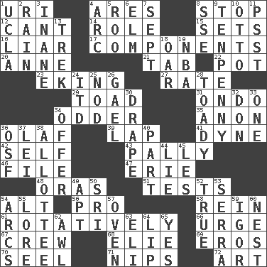 ACROSS 1. RI univ. 4. Ancient Greek god of war 8. Obstruct or block passage 12. Patter 14. Hero or heavy, e.g. 15. Puts into a specified state 16. One who doesn't tell the truth 17. Pieces 20. Singer Murray 21. Keyboard key 22. Plant holder 23. Supplementing with great effort 27. Assign a rank or rating to 29. Frog relative 31. Southwest Nigerian state 34. More peculiar 35. At once, immediately (arch.) 36. Norwegian king 39. Pet locale 41. Centimeter-gram-second unit of force 42. Oneself 43. Chummy 46. Do some clerical work 47. One of the Great Lakes 48. Mouths or openings 51. Trials 54. The first octave above the treble staff 56. Adept person 58. It's straight from the horse's mouth 61. Producing rotation 66. Goad 67. Group working together 68. Writer Wiesel 69. Greek god of love 70. Stitch closed the eyes of (a falcon) 71. Pinches, bites 72. Nonscientific branch of learning DOWN 1. Southern CA. univ. 2. Water falling in drops from the sky 3. Empty; void 4. Curve 5. Friend of Pooh 6. Shade tree 7. Back-to-school mo. 8. Compass dir. 9. 3-inch nail 10. "Beetle Bailey" pooch 11. Inconspicuous attention getter 13. Long journey 18. Boat paddle 19. Basketball assoc. 24. It would 25. Lower and raise head in agreement 26. Highlander 28. Sycophant 30. Window treatment 32. Spanish title 33. Single 34. Auction bid 36. Order of Saint Francis (abbr.) 37. Luau accessory 38. One to whom something is allotted 40. Role in a play 44. Falsehood 45. French article 49. Fitting 50. Indian title of respect (Mr.) 52. Loyal 53. Spanish missionary in California 54. Arches 55. Old wives' tales, e.g. 57. Baking chamber 59. Composer Stravinsky 60. Egg locale 62. Leather borer 63. Connecticut Ivy Leaguer 64. Mouth edge 65. It is so