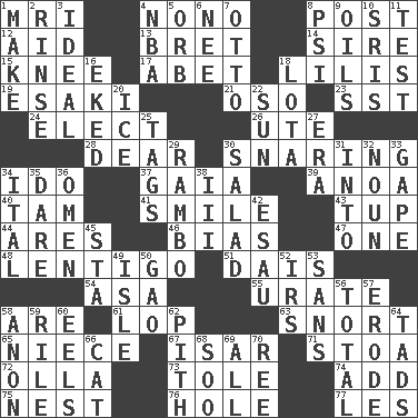 ACROSS 1. Medical imaging device (abbr.) 4. Words to Nanette 8. Mail 12. Help 13. Cy Young winner Saberhagen 14. The founder of a family 15. Leg joint 17. Collude with 18. Ms. Damita and namesakes 19. 1973 Nobel Price Winner (Physics) Leo 21. Bear (Spanish) 23. Fast jet (abbr.) 24. Opt 26. Shoshoni 28. Letter starter 30. Catching in a trap 34. Wedding promise 37. Greek goddess of the earth (variant) 39. Small Philippine buffalo 40. Scottish cap 41. Grin 43. Uncastrated adult male sheep 44. Ancient Greek god of war 46. Prejudice 47. Single 48. Small, flat, pigmented spot on the skin 51. Raised platform 54. White ___ sheet 55. A salt of uric acid 58. "We ___ not amused" (Victoria) 61. Trim (branches) 63. Derisive sound 65. Sibling's daughter 67. Austrian river, tributary to the Danube 71. Portico 72. Rounded earthenware pot or jar 73. Lacquered or enameled metalware 74. Find the sum of 75. Egg locale 76. Hollow 77. French article DOWN 1. Cause to be 2. Remove soap 3. Standard of perfection 4. Basketball assoc. 5. Globe 6. Born 7. "Beetle Bailey" pooch 8. 23rd letter of the Greek alphabet 9. Petroleums 10. Indian titles of respect 11. Trial 16. Made supply last 18. Globular water bottle used in Asia 20. Frozen water 22. Player for Phoenix 25. Labels 27. Epoch 29. Role for Stallone 30. First course 31. To the inside or interior of 32. Part of speech 33. Yawn 34. Slanted text style (abbr.) 35. Have the gumption 36. Sign of something about to happen 38. One more than two 42. He sold his birthright 45. R.R. building 49. Small island 50. E Mali city 52. Big collection agency 53. Without 56. Add up to 57. Eat (away) 58. Soon (poet.) 59. Cause heat under the collar 60. Snakelike fish 62. Essential or central part 64. Bits 66. Feline 68. "Barney Miller" actor Jack 69. 100% 70. To sift