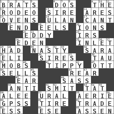 ACROSS 1. Naughty children 6. Two (Sp.) 9. Definite Article 12. Cowboy competition 13. Father 14. Ancient Greek god of war 15. Baking chambers 16. Uhlan (variant) 17. Patter 18. Conclude 19. Snakelike fish 20. Charged atoms 21. Whirlpool 23. Big collection agency 24. Paradise 25. An arm off of a larger body of water 28. Possessed 30. Characterized by obscenity 34. "Two Mules for Sister ____" 35. Biblical high priest 36. Male parents of animals 38. The 19th letter of the Greek alphabet 39. Disorderly crowds 41. Likely to tip or tilt 43. Baseball player Mel 44. Exchanges for money 46. Bring up, as a child 48. Ewer handle 49. Backtalk 50. Against 51. Stricken, poetically 53. Make lace 56. Toward shelter 57. Mountain range 58. Nest on high 60. Global Positioning Systems (abbr.) 61. Hoop that covers a wheel 62. Swap 63. Curvy letter 64. Compass dir. 65. NE Netherlands city DOWN 1. Sis' sibling 2. Be footloose 3. An important port of Yemen 4. Watched over 5. Distress signal 6. Deli pickle 7. Mouths or openings 8. Elected rep. 9. Interpreter 10. Coop moms 11. Eastern Standard Time (abbr.) 13. Chop _ 14. Oak nuts 19. Ferber et al. 20. One more than two 22. Lair 24. The property of being fit to eat 26. Part of Q.E.F. 27. Strained 28. Folds over and sews together 29. Medicinal plant 31. Be seated 32. Three (prefix) 33. Slangy assent 37. Small fatty European fish 40. Chalkboards 42. It is so 45. Indian title of respect (Mr.) 47. Michaelmas daisies 49. Filth; sediment 50. High mountains 51. Indian titles of respect 52. Female horse 54. Ancient river in northeast Turkey 55. Event that recurs at intervals 56. Ripen 57. Shoshoni 58. _ moment's notice (2 wds.) 59. Car or cant ending