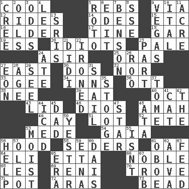 ACROSS 1. Calm and collected 5. Confederate soldiers (slang) 9. By way of 12. Amusement-park features 14. Lyric poems 15. And so on (abbr.) 16. A person who is older than you are 17. Prong on a fork 18. Slender fish 19. Double-curved letter 20. Foolish or stupid persons 23. Diluted with white 24. SW Saudi Arabia district 25. Mouths or openings 27. 90 degrees 30. Two (Sp.) 32. And not 33. Double curve, resembling the letter S 34. Taverns 36. Baseball player Mel 38. Born 39. Erode 40. Sep. follower 43. Flaplike covering 46. "Vaya con ____" 48. Housemaid 49. Island 51. Car dealer's back yard 52. Wig 53. Ancient Persian 54. Greek goddess of the earth (variant) 56. Parka part 58. Spring feasts 61. Clumsy lout 64. Biblical high priest 65. Singer James 66. Impressive in appearance 68. French article 69. Painter Guido (1575-1642) 70. Collection of objects 71. Plant holder 72. Caspian sea tributary 73. Necklace unit DOWN 1. Algonquian 2. Lubricates 3. Likelihood 4. Area sheltered from the wind 5. Printing process, for short 6. Prepare for publication 7. Gillaume's butler role 8. Compass dir. 9. Viva Las _ 10. Slanted text style (abbr.) 11. Land measure 13. Indian titles of respect 21. "You Light Up My Life" star Conn 22. Pressed 23. Piece 24. Had dinner 26. Friend of Pooh 27. Period of immesurable duration 28. Personal question 29. Stitch closed the eyes of (a falcon) 31. Slow-paced one 35. Moe Howard, for one 37. Heavy book 41. Feline 42. Definite Article 44. On the rocks 45. June honoree 47. Play the lead 48. "One Day ___ Time" 50. Of or pertaining to yesterday 53. Wet 55. Is not 56. Assist 57. Butter sub 59. Inactive volcano in Sicily 60. Raised platform 61. Mitch Miller's instrument 62. Inventor's middle name 63. Nourish 65. Period 67. Globe