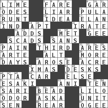 ACROSS 1. Welles in "The Third Man" 5. Conductor's collection 9. Slender fish 12. Lyric poems 13. One who doesn't tell the truth 14. Monetary unit of Botswana 15. Undersized animal 16. It may be bright or harebrained 17. Flair 18. Working for oneself (abbr.) 19. Fitting 21. Feeling or showing extreme anger 22. Does sums 24. Was introduced to 26. Turn to the right 27. Large numbers or amounts 28. Without 29. Ache 30. One of three equal parts 32. Ancient Greek god of war 36. Johnson of "Laugh-In" 37. The first octave above the treble staff 38. Greater amount 39. 24-hour periods 40. Came up 42. 43,560 square feet 43. Dec. holiday 44. Writing tables 46. Parent Teacher Association (abbr.) 49. Automobile 50. Otherwise 51. 1973 Nobel Price Winner (Physics) Leo 53. Cuckoo 54. Nine, plus one 57. Indian skirt 58. Necklace unit 61. _ and Stitch 62. Aroma 63. "____ silly question..." 64. A single undivided whole 65. Elected rep. 66. Bring up, as a child 67. Double curve, resembling the letter S DOWN 1. Australian parrot (variant) 2. Goddess of spring and wife of Bragi 3. Ananias' fault 4. Eastern Standard Time (abbr.) 5. Sudden quick movement 6. Help 7. Actress Charlotte 8. Epoch 9. POW camp 10. Having winglike extensions 11. The wife of a rajah (variant) 14. For each 19. Increase 20. Inconspicuous attention getter 21. It is 23. Natives or inhabitants of Denmark 24. Shops 25. Conclude 27. "Two Mules for Sister ____" 28. Grain storage towers 29. Writing tablet 31. Ethiopian city, capital of Harari 32. Collect or gather 33. Shooting up abruptly 34. Blunders 35. Observe 40. Wet nurse (var.) 41. Locale of original sin 43. One more than ninety 45. Biblical high priest 46. Mexican monetary units 47. Sadhe (variant) 48. Composer Copland 52. Apertif with cassis 53. The sixth month of the Jewish calendar 55. Writer Wiesel 56. Short letter 58. Soap unit 59. Compass dir. 60. Alias (abbr.) 61. Nilotic language