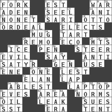 ACROSS 1. Tined utensil 5. Eastern Standard Time (abbr.) 8. Armed conflict 11. An important port of Yemen 12. Stitch closed the eyes of (a falcon) 14. Cuckoo 15. Music written for nine 17. Indian skirt 18. "Beetle Bailey" pooch 19. Severe or trying experience 21. Chooses 23. Java container 25. Small pie 26. San ____ (Riviera town) 27. Environmental prefix 28. Mountains (abbr.) 31. Frozen water 33. Fenced enclosure 35. Navigate 37. Tending to cause great harm 38. Declare 40. Opposed to 41. Letch 43. Commissioned military rank (abbr.) 45. Purpose 46. Compass dir. 47. Single 50. For fear that 52. Style 53. Infant locale 54. Most capable 56. Portable computer 61. Nights before holidays 62. Type of rug 65. Typical standards 66. Lubricate 67. Path through which fluid escapes 68. Takes to court 69. Fast jet (abbr.) 70. Epoch 71. Portable shelter DOWN 1. Papal veil 2. Aroma 3. Tear apart 4. Leg joint 5. Double-curved letter 6. Ocean 7. Cigar-shaped 8. Electrical Unit 9. Pismires 10. River (Sp.) 13. Pale purple color 16. Not wild 18. Sep. follower 20. Mass 22. Greek god of love 24. Leaves 26. Depend 28. Not women's 29. Wig 30. _ Lanka 31. _ the terrible 32. Quote 34. Tired old horse 36. Drawn tight 37. Compass dir. 39. Shout 42. Hero or heavy, e.g. 44. Anneal 48. Rhinal 49. Main course 51. Connect, as a bridge 52. Raised railways 54. Advice 55. Waist strap 57. Mail 58. Loyal 59. Sign of something about to happen 60. Inconspicuous attention getter 61. Greek goddess of the dawn 63. Ewer handle 64. Alias (abbr.)