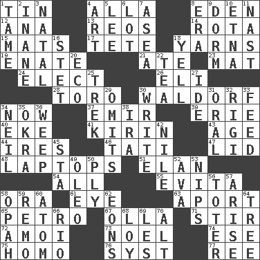 ACROSS 1. Shallow baking pan 4. Silent film actress Nazimova 8. Genesis locale 12. Santa ___, CA 13. Vintage cars 14. Roll call or roster of names 15. Floor protectors 17. Wig 18. Entertaining tales 19. Related on the mother's side 21. Had dinner 23. Floor protector 24. Voters do this 26. Biblical high priest 28. "Corrida" creature 30. Apple salad 34. Immediately 37. Independent ruler or chieftain 39. One of the Great Lakes 40. Supplement with great effort 41. Japanese brewing company 43. Grow older 44. Angers 46. Jacques of French films 47. Hat (slang) 48. Portable computers 51. Enthusiasm 54. 100% 55. Webber/Rice musical 58. Mouth or opening 61. Sight organ 63. To the left, to Queeg 65. Stone: prefix 67. Rounded earthenware pot or jar 71. Tumult 72. Mine, in Marseilles 73. Christmas carol 74. Compass dir. 75. Same (prefix) 76. System (abbr.) 77. To sift DOWN 1. Not wild 2. Empty; void 3. Brizilian seaport 4. Tate display 5. Area sheltered from the wind 6. Car dealer's back yard 7. At sea 8. Period 9. Dormintory (informal) 10. Inactive volcano in Sicily 11. Political cartoonist Thomas 16. Proofreading order 18. Shout 20. Environmental prefix 22. Beverage made from leaves 25. Long journey 27. Binary compound 29. Leaves out 30. Compose 31. Taken by mouth 32. Swiss mountan, "Queen of the Mountains" 33. Nourish 34. Famous astronaut Armstrong 35. Gumbo ingredient 36. Shed a tear 38. Retirement account (abbr.) 42. The longest river in the world 45. R.R. building 49. Margarine 50. Strand of rope, yarn or thread 52. Actress Gardner 53. Pinches, bites 56. Carrier 57. Get up 58. Brightly colored fish 59. San ____ (Riviera town) 60. Tiny particle 62. Immeasurably long periods of time 64. Relationship diagram 66. River (Sp.) 68. Myrna of the movies 69. French article 70. The first octave above the treble staff