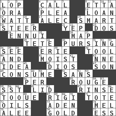 ACROSS 1. Trim (branches) 4. Give a ring to 8. Singer James 12. Mouth or opening 13. Entreaty 14. Grant temporary use of 15. Electrical Unit 17. Actor Baldwin 18. Don Adams' spy role 19. Guide 21. Slangy assent 23. Two (Sp.) 24. World-weariness 26. Atlas unit 28. Wig 30. Puckering 34. Observe 37. 4th largest of the Great Lakes 39. Implement 40. Added to 41. Wet 43. Compass dir. 44. The main thing one is thinking about 46. "Vaya con ____" 47. Manchild 48. Eat 51. Without 54. For each 55. Makeup applied to the cheeks 58. Fast jet (abbr.) 61. Flaplike covering 63. Wash lightly 65. Woman's close-fitting hat 67. Swiss mountan, "Queen of the Mountains" 71. Carryall 72. Petroleums 73. Arabian gulf 74. Cartoonist voice _ Blanc 75. Toward shelter 76. Gilt 77. Double-curved letter DOWN 1. Moos 2. Speak pompously 3. Eucharist need 4. Tax preparer (abbr.) 5. 100% 6. Area sheltered from the wind 7. Made of lace 8. Shade tree 9. Frog relative 10. Edible starchy tuberous root 11. Pismires 16. Portable shelter 18. Practice fight 20. Regret 22. Australian flightless bird 25. A whole individual unit 27. Pacific Standard Time (abbr.) 29. Wear away 30. Mexican monetary units 31. Charged particles 32. Words to Nanette 33. Small, secluded valley 34. Ketch in the Levant 35. Inside; within (prefix) 36. Locale of original sin 38. One more than two 42. Russian ruler of old 45. Viper 49. Ubangi River tributary 50. Medical imaging device (abbr.) 52. Not either 53. Costume for a special activity 56. Dwarf 57. _____ Park, CO 58. Portico 59. The visible part of the earth's surface 60. Lacquered or enameled metalware 62. To draw with force 64. Snakelike fish 66. Purpose 68. Wedding promise 69. Set 70. Indiana (abbr.)