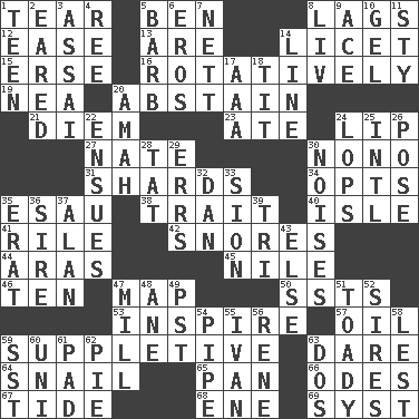 ACROSS 1. Separate forcefully 5. Benjamin's nick name 8. Falls behind 12. Comfort 13. "We ___ not amused" (Victoria) 14. It is permitted: Lat. 15. Celtic language 16. Producing rotation 19. Teachers' org. 20. Choose not to consume 21. South Vietnam president (1954) 23. Had dinner 24. Mouth edge 27. Nathan's nickname 30. Words to Nanette 31. Broken pieces 34. Chooses 35. Son of Isaac 38. Distinguishing feature 40. Small island 41. Cause heat under the collar 42. Sounds asleep 44. Caspian sea tributary 45. Mediterranean tributary 46. "___ Little Indians" 47. Atlas unit 50. Fast planes 53. Stimulate to action 57. Petroleum 59. Supplying deficiencies 63. Have the gumption 64. Slow-paced one 65. Baking dish 66. Lyric poems 67. Event that recurs at intervals 68. Compass dir. 69. System (abbr.) DOWN 1. Adolescent 2. Having ears or earlike features 3. Slender Brazilian palm 4. To separate or throw off 5. Sharp remark 6. Greek god of love 7. Remaining after all deductions 8. 54 in ancient Rome 9. Adept person 10. Set 11. Filthy place 14. Actor's bit 17. American Automobile Association (abbr.) 18. Teat (slang) 20. Housemaid 22. Follows as a consequence or result 24. Chops off 25. International (abbr.) 26. Introduce or present, as a question 28. Make lace 29. Blunders 30. Annoying sounds 32. Daniel's nick name 33. The Jewish people; Israel 35. Part of Q.E.F. 36. Father 37. ____ Jay Lerner 39. Three (prefix) 43. Otherwise 47. Place where flour is made 48. One (Scot) 49. Pacific Standard Time (abbr.) 51. Sycophant 52. Fathers 54. Corncob 55. _ the terrible 56. French philosopher Descartes 58. For fear that 59. Fast jet (abbr.) 60. Corn or form start 61. Groovy apt. 62. Sliced dessert 63. Two (Sp.)