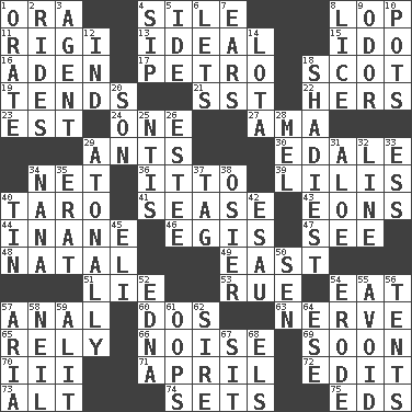ACROSS 1. Mouth or opening 4. Drop; flow; fall 8. Trim (branches) 11. Swiss mountan, "Queen of the Mountains" 13. Standard of perfection 15. Wedding promise 16. Arabian gulf 17. Stone: prefix 18. Native of Scotland 19. Watches over 21. Fast jet (abbr.) 22. Possessive pronoun 23. Eastern Standard Time (abbr.) 24. Single 27. Wet nurse (var.) 29. Pismires 30. Peak District village in England 34. Fish or hair follower 36. "Tell ____ the Marines!" 39. Ms. Damita and namesakes 40. Pacific island yam 41. Gospel singer Marvin 43. Immeasurably long periods of time 44. Lacking in sense or substance 46. The front part of a cuirass 47. Perceive with the eye 48. Relating to or accompanying birth 49. Compass direction 51. Untruth 53. Sorrow 54. Consume 57. Of or related to the anus 60. Two (Sp.) 63. Impudent aggressiveness 65. Have confidence or faith in 66. Annoying sound 69. Within a short period 70. One more than two 71. Showery time 72. Prepare for publication 73. The first octave above the treble staff 74. Arranges properly for use 75. Begley and Asner DOWN 1. Declaim 2. Amusement-park features 3. Representative 4. Small drink 5. Binary compound 6. Allows 7. Hearing organs 8. Louse (plural) 9. Aroma 10. Cooking vessels 12. Indiana (abbr.) 14. Globular water bottle used in Asia 18. Most dubious of character or honesty 20. Manchild 25. Nuclear Threat Initiatives 26. First name in cosmetics 28. Cartoonist voice _ Blanc 29. Lacking a tonal center or key 31. Medicinal plant 32. Actor's bit 33. Curvy letter 34. Nanny 35. Part of Q.E.F. 37. Label 38. Flexible twig of a willow tree 40. Metal container 42. He sold his birthright 45. Connecticut Ivy Leaguer 50. Elected rep. 52. Pulitzer Prize-winning author Ferber 54. Wear away 55. Prevent the occurrence of 56. Portable shelters 57. Roberta Peters solo 58. Famous astronaut Armstrong 59. Came down and settled, as after flight 61. I made a mistake 62. Title for a man of rank and authority 64. Compass dir. 67. Be seated 68. Raised railways