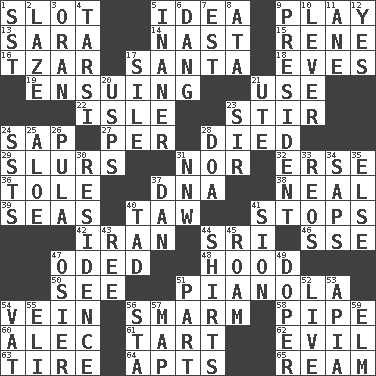 ACROSS 1. Groove 5. The main thing one is thinking about 9. Shaw product 13. "Two Mules for Sister ____" 14. Political cartoonist Thomas 15. French philosopher Descartes 16. Russian ruler 17. Before Barbara or Clara 18. Nights before holidays 19. Following as a consequence or result 21. Purpose 22. Capri or Wright 23. Move through with a circular motion 24. Plant excrement 27. For each 28. Passed on 29. Runs notes together 31. Or not 32. Celtic language 36. Lacquered or enameled metalware 37. Heredity factor (abbr.) 38. Anneal 39. Oceans 40. The 23rd letter of the Hebrew alphabet 41. Ceases 42. SW Asia republic 44. _ Lanka 46. Compass dir. 47. Wrote a lyric poem 48. Parka part 50. Perceive with the eye 51. Player piano 54. Distinctive style or manner 56. Excessive but superficial compliments 58. Corncob 60. Actor Baldwin 61. Small pie 62. Morally bad or wrong 63. Become fatigued 64. Tenement units (abbr.) 65. 480, 500 or 516 sheets of paper DOWN 1. Fast jet (abbr.) 2. Goldbrick 3. NW Algerian seaport 4. Tarsus (plural) 5. Sillier 6. Mild oath, euphamism for damn 7. Eastern Standard Time (abbr.) 8. _ moment's notice (2 wds.) 9. Elected leader of a country 10. Prying instrument 11. One (Scot) 12. It is so 17. Filth; sediment 20. United States Postal Service (abbr.) 21. Shoshoni 23. Title for a knight 24. Fast planes 25. Medicinal plant 26. Monetary unit of Botswana 28. ___ good deed 30. Dwelling 31. Compass dir. 33. Vintage cars 34. Plant excrements 35. Otherwise 37. One of the 12 tribes of Israel 40. Small amount or degree 41. The Jewish people; Israel 43. Portuguese money of account (variant) 44. Upper-body garments 45. Wander 47. Flexible twig of a willow tree 49. Drug addict 51. Component 52. Moving, as bait 53. Capital of Western Samoa 54. Large container 55. Biblical high priest 56. R.R. building 57. Atlas unit 59. Shade tree