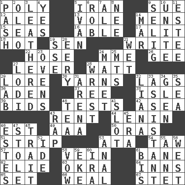 ACROSS 1. Much (prefix) 5. SW Asia republic 9. Institute legal proceedings 12. Toward shelter 13. Short-tailed, large-bodied rat 14. Not women's 15. Oceans 16. Competent 17. Set down 18. Being at a high temperature 19. Elected rep. 21. Compose 22. Flexible conduit 24. Madame (abbr.) 26. Unit of force equal to gravity 27. Prying instrument 28. Electrical Unit 29. Old wives' tales, e.g. 30. Tall tales 32. Falls behind 36. Arabian gulf 37. Portuguese money of account (variant) 38. Small island 39. Auction offers 40. Trials 42. At sea 43. Monthly bill 44. Soviet premier 1918-24 46. Eastern Standard Time (abbr.) 49. Auto club (abbr.) 50. Mouths or openings 51. Long narrow piece of something 53. _ moment's notice (2 wds.) 54. The 23rd letter of the Hebrew alphabet 57. Frog relative 58. Distinctive style or manner 61. Object of repulsion 62. Writer Wiesel 63. Gumbo ingredient 64. Lodging establishments 65. Arrange properly for use 66. Welt 67. Proofreading order DOWN 1. Romantic infatuation 2. Butter sub 3. Resembling or made to resemble leather 4. Consenting reply 5. _ the terrible 6. Director Reiner 7. Everything 8. Born 9. Former Milwaukee Brewers owner Bud 10. Join together 11. First name in cosmetics 14. Spoil 19. Compass dir. 20. Suggestive of the supernatural 21. Soggy 23. Baking chambers 24. French painter Edouard 25. Mountains (abbr.) 27. Farming town in central California 28. Take or capture by force 29. Experiment locale 31. Sports stadium 32. Woody, climbing, usually tropical plant 33. Helper 34. Small, secluded valley 35. Ocean 40. Beverage made from leaves 41. Notch 43. Hit sharply and swiftly 45. Epoch 46. _____ Park, CO 47. Fur scarf 48. Distinguishing feature 52. Binary compound 53. Of or related to the anus 55. Singer Murray 56. Compass direction 58. Promise 59. Make supply last 60. Lyricist Gershwin 61. Altar cloth linen