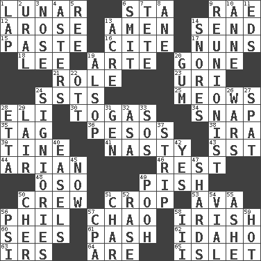 ACROSS 1. Type of eclipse 6. R.R. building 9. Actress Charlotte 12. Came up 13. So be it 14. Post 15. Thick mixture 16. Quote 17. Religious women 18. Area sheltered from the wind 19. Johnson of "Laugh-In" 20. Went 21. Hero or heavy, e.g. 23. RI univ. 24. Fast planes 25. Catcalls? 28. Biblical high priest 30. Ancient Roman robes 34. Fastener 35. Label 36. Mexican monetary units 38. Retirement account (abbr.) 39. Prong on a fork 41. Difficult 43. Fast jet (abbr.) 44. Believer in; advocate of (suffix) 46. Remainder 48. Bear (Spanish) 49. Expression of disdain 50. Group working together 51. Riding implement 53. Actress Gardner 56. Silvers or Donahue 57. US Secretary of Labor Elaine L. _ 58. From or relating to Ireland 60. Perceives with the eye 61. Romantic infatuation 62. Potato state 63. Big collection agency 64. "We ___ not amused" (Victoria) 65. Small island DOWN 1. Pet locale 2. Mountain range 3. Olfactory organ 4. Michaelmas daisies 5. To separate or throw off 6. Stricken, poetically 7. Wig 8. A saturated hydrocarbon 9. One who advocates reunion 10. Singer Murray 11. Begley and Asner 13. 43,560 square feet 14. Sounds asleep 19. Columnist Joseph or Stewart 20. Chewing product 22. Baseball player Mel 24. Seigniories (variant) 26. Armed conflicts 27. Argument over a trivial matter 28. Singer James 29. Den 31. Commissioned mil. rank 32. White ___ sheet 33. Distress signal 37. Remove all contents or possession from 40. Artist's stands 42. Consenting reply 45. Immediately 47. Broken pieces 49. "Silly old bear" 50. "Mermaids" star 51. Burn to charcoal 52. Raze (variant) 54. Small bottle 55. American tennis player Robert 56. Air pressure measure (abbr.) 57. Accounting whiz (abbr.) 58. One more than two 59. Being at a high temperature