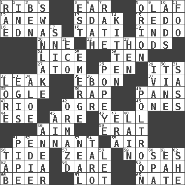 ACROSS 1. Teases 5. Ewer handle 8. Norwegian king 12. Afresh 13. Neighbor of Neb. 15. Make new 16. Ferber et al. 18. Jacques of French films 19. Southeast Asian peninsula 20. Compass dir. 22. Modes 24. Louse (plural) 26. "___ Little Indians" 27. Smallest unit of an element 28. Fenced enclosure 29. It is 32. Path through which fluid escapes 35. Inky black, to poets 37. By way of 38. Stare 39. Hit sharply and swiftly 40. Baking dishes 41. _ de Janeiro 42. Legendary monster 43. Washington bills 44. Compass dir. 45. "We ___ not amused" (Victoria) 46. Shout 49. Direct toward a target or goal 50. Part of Q.E.F. 51. Pre-World Series prize 55. Atmosphere 56. Periodic rise and fall of the sea level 57. Ardor 59. Olfactory organs 63. Capital of Western Samoa 64. Have the gumption 65. Brightly colored fish 66. Fermented drink made from hops 67. Car dealer's back yard 68. Nathan's nickname DOWN 1. Actress Charlotte 2. Working for oneself (abbr.) 3. Benjamin's nick name 4. Tchaikovsky ballet 5. Eastern Standard Time (abbr.) 6. First of billions? 7. Pace 8. Greek mythologigal hunter 9. Grant temporary use of 10. Sums up 11. Egg _ yung 14. Baby cat 17. In a ____ (agitated or irritated) 21. Environmental prefix 23. Layer 25. Develop 28. Wimpy's pal 29. "Terrible" tsar 30. Prong on a fork 31. Backtalk 32. Old wives' tales, e.g. 33. The front part of a cuirass 34. Medicinal plant 36. Tavern 40. Coward 42. Chief deity of Zoroastrianism 45. The 18th letter of the Arabic alphabet 47. Epoch 48. (Had) reclined 49. Approach 51. Corncob 52. Singer Brickell 53. Anneal 54. Edible starchy tuberous root 56. Bar bill 58. Allow 60. Health resort 61. Ingest 62. A female animal or person