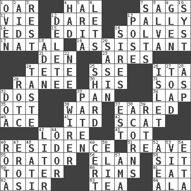 ACROSS 1. Rowing implement 4. Actor Linden 7. Droops 11. Compete 12. Have the gumption 13. Chummy 14. Begley and Asner 15. Prepare for publication 16. Finds the solution 17. Relating to or accompanying birth 19. Aide 21. Lair 23. Ancient Greek god of war 24. False hair 25. Compass dir. 26. Call ___ day 29. The wife of a rajah (variant) 30. Part of HMS, perhaps 31. Mayday 32. Two (Sp.) 33. Baking dish 34. Infant locale 35. Baseball player Mel 36. Armed conflict 37. Having ears or earlike features 40. Adept person 41. It would 42. Jazz singing style 43. Old wives' tales, e.g. 45. Small child 46. Home 51. Rob, plunder, or pillage 55. Speaker 56. Enthusiasm 58. Be seated 59. Carrier 60. Basketball hoops 61. Consume 62. SW Saudi Arabia district 63. Beverage made from leaves 64. Wing DOWN 1. Baking chamber 2. Opera by Verdi 3. State of inaction 4. Possessed 5. Operatic vocal solo 6. Allows 7. Table seasonings 8. Inventor's middle name 9. Small, secluded valley 10. System (abbr.) 12. Erase 13. Introduce or present, as a question 16. Male parents of animals 18. An important port of Yemen 20. Indian antelope 22. Born 24. Clothes sense 25. Broken piece 26. Small island 27. Frog relative 28. Viper 29. College mil. group 32. ___ good deed 33. Eucharist need 36. One who wires 37. Eastern Standard Time (abbr.) 38. Oak nuts 39. Assign a rank or rating to 43. 61 cubic inches 44. Scent 46. Round or rotation of duties 47. Greek god of love 48. Suttee (variant) 49. Sure thing 50. Writer Wiesel 52. Toward the sea 53. Small bottle 54. Singer James 57. Housemaid (var.)