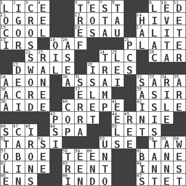 ACROSS 1. Louse (plural) 5. Trial 9. Directed 12. Legendary monster 13. Round or rotation of duties 14. Hub of activity 15. Calm and collected 16. He sold his birthright 17. Set down 18. Big collection agency 19. Clumsy lout 21. Food holder 22. Indian titles of respect 24. Affectionate concern, for short 26. Auto 27. A sleeping potion; an opiate (poet.) 28. Angers 29. A really long time 30. Slender Brazilian palm 32. "Two Mules for Sister ____" 36. 43,560 square feet 37. Shade tree 38. SW Saudi Arabia district 39. Helper 40. Streamer paper 42. Small island 43. Sweet dark-red dessert wine 44. Bert's buddy 46. _-fi 49. Health resort 50. Allows 51. Tarsus (plural) 53. Purpose 54. The 23rd letter of the Hebrew alphabet 57. Mitch Miller's instrument 58. Adolescent 61. Object of repulsion 62. Actor's bit 63. Monthly bill 64. Taverns 65. Followers of ems 66. _ china 67. Proofreading order DOWN 1. Event scenes 2. Composer Stravinsky 3. What you're doing now 4. Snakelike fish 5. Unclean, religiously 6. Greek goddess of the dawn 7. R.R. building 8. The 19th letter of the Greek alphabet 9. Pale purple color 10. Webber/Rice musical 11. Prevent from occurring 14. Actor Linden 19. Lubricate 20. At sea 21. Personal Computers (abbr.) 23. Indian princess (variant) 24. _____ steamer (cargo ship) 25. Luau accessory 27. Tenth: prefix 28. Small island 29. American Automobile Association (abbr.) 31. Father Junipero _ 32. Inhabitant of Heaven 33. Helper 34. Cause heat under the collar 35. "We ___ not amused" (Victoria) 40. Police officer (slang) 41. Snakelike fish 43. Air pressure measure (abbr.) 45. Portuguese money of account (variant) 46. Took without asking 47. Small house or cottage 48. Removes the wrinkles 52. Observe 53. To (old English) 55. Singer Murray 56. Compass direction 58. Three (prefix) 59. Car or cant ending 60. Conclusion 61. Altar cloth linen