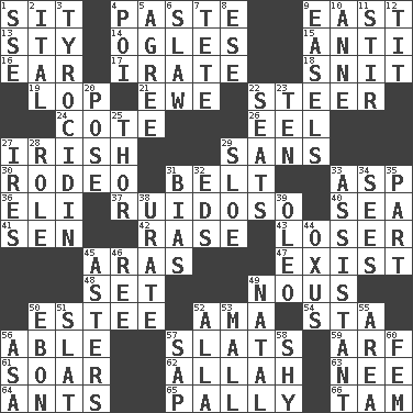 ACROSS 1. Be seated 4. Thick mixture 9. Compass direction 13. Filthy place 14. Stares 15. Opposed to 16. Ewer handle 17. Feeling or showing extreme anger 18. In a ____ (agitated or irritated) 19. Trim (branches) 21. She-sheep 22. Navigate 24. ____ d'Azur (French Riviera) 26. Snakelike fish 27. From or relating to Ireland 29. Without 30. Cowboy competition 31. Waist strap 33. Viper 36. Connecticut Ivy Leaguer 37. Noisy, rowdy, vocal (Spanish) 40. Ocean 41. Elected rep. 42. To erase 43. Failure 45. Ancient river in northeast Turkey 47. Have an existence 48. Put into a specified state 49. Horse sense 50. First name in cosmetics 52. Wet nurse (var.) 54. R.R. building 56. Competent 57. Narrow boards 59. Sandy's bark 61. Fly high 62. Assad's deity 63. Born 64. Pismires 65. Friendly 66. Scottish cap DOWN 1. Compass dir. 2. Slanted text style (abbr.) 3. Polypeptide antibiotic 4. Luau course 5. Match 6. Cole _ (cabbage dish) 7. False hair 8. Compass dir. 9. Artist's stands 10. Queen of England 1702-14 11. Move through with a circular motion 12. Teat (slang) 20. Introduce or present, as a question 22. Theater features 23. Nine, plus one 25. Son of Odin 27. Angers 28. Hero or heavy, e.g. 29. A type of plum 31. Prejudice 32. Begley and Asner 33. Aide 34. Observes 35. Role in a play 38. A salt of uric acid 39. Butter sub 44. Amu Darya 45. Michaelmas daisies 46. To sift 49. Brizilian seaport 50. Inky black, to poets 51. Narrow board 52. Silent film actress Nazimova 53. Shopping center 55. Type of rug 56. White ___ sheet 57. Plant excrement 58. Like a shrinking violet 60. Opposite of masc.