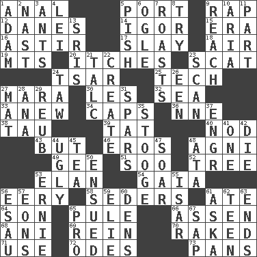 ACROSS 1. Of or related to the anus 5. Left side of a ship or aircraft 9. Hit sharply and swiftly 12. Natives or inhabitants of Denmark 14. Composer Stravinsky 15. Epoch 16. Having gotten out of bed 17. Kill 18. Wind 19. Mountains (abbr.) 20. Strong, restless desires 23. Scram, to a cat 24. Russian ruler of old 25. Technology 27. Hindu Mythology: god of death 30. French article 32. Ocean 33. Afresh 34. Smile enhancers 36. Compass dir. 38. The 19th letter of the Greek alphabet 39. Make lace 40. Lower and raise head in agreement 43. Yet 46. Greek god of love 48. Hindu god of fire 49. Turn to the right 51. "Barney Miller" actor Jack 52. Relationship diagram 53. Flair 54. Greek goddess of the earth (variant) 56. Suggestive of the supernatural 58. Spring feasts 61. Had dinner 64. Male offspring 65. Whine 66. NE Netherlands city 68. Black tropical American cuckoo 69. It's straight from the horse's mouth 70. Moved through 71. Purpose 72. Lyric poems 73. Baking dishes DOWN 1. First man 2. Political cartoonist Thomas 3. Pismires 4. Flowery wreath 5. Expression of disdain 6. Stare at amorously 7. Cooks with dry heat, as in an oven 8. Attempt to accomplish something 9. Arrive at 10. Operatic vocal solo 11. Piece 13. Indian titles of respect 21. Baby powder 22. Make 23. Skim 24. The 23rd letter of the Hebrew alphabet 26. Car or cant ending 27. Floor protector 28. Santa ___, CA 29. Reuben's nickname 31. Practice fights 35. Moe Howard, for one 37. Engineer (abbr.) 41. Single 42. Pass on 44. Repulsive 45. Afternoon social gathering 47. Fly high 48. _ moment's notice (2 wds.) 50. Took place subsequently 53. Bert's buddy 55. Austrian river, tributary to the Danube 56. Son of Isaac 57. Immeasurably long periods of time 59. Writer Wiesel 60. Habitations of wild animals 61. "____ silly question..." 62. Adolescent 63. Conclusions 65. Adept person 67. Plant excrement
