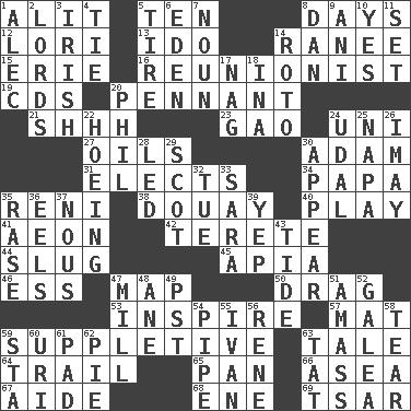 ACROSS 1. Set down 5. Nine, plus one 8. 24-hour periods 12. Australian parrot (variant) 13. Wedding promise 14. The wife of a rajah (variant) 15. One of the Great Lakes 16. One who advocates reunion 19. Music discs 20. Pre-World Series prize 21. Quiet! 23. E Mali city 24. Single; one (prefix) 27. Petroleums 30. First of billions? 31. Chooses 34. Dad 35. Painter Guido (1575-1642) 38. A city in N France, SE of Calais 40. Romp 41. A really long time 42. Cigar-shaped 44. A hard, heavy blow 45. Capital of Western Samoa 46. Curvy letter 47. Atlas unit 50. To be drawn or hauled along 53. Stimulate to action 57. Floor protector 59. Supplying deficiencies 63. Story 64. Hang back 65. Baking dish 66. Toward the sea 67. Helper 68. Compass dir. 69. Russian ruler of old DOWN 1. Actor Baldwin 2. Nobles 3. From or relating to Ireland 4. Make a knot 5. Become fatigued 6. Genesis locale 7. Part of speech 8. One of the 12 tribes of Israel 9. Black tropical American cuckoo 10. Affirmative reply 11. Put into a specified state 14. Printing process, for short 17. Tired old horse 18. _ tizzy (2 wds.) 20. Silvers or Donahue 22. Weeding 24. Hereditary estate 25. California wine valley 26. "If ____ say so..." 28. Directed 29. Native of Scotland 30. Seem 32. Third day of the wk. 33. "Two Mules for Sister ____" 35. Raze (variant) 36. Snakelike fish 37. Common sense 39. Slangy assent 43. Periodic rise and fall of the sea level 47. Place where flour is made 48. One (Scot) 49. Pacific Standard Time (abbr.) 51. Collect or gather 52. An organ shaped like a helmet 54. Corncob 55. "Terrible" tsar 56. French philosopher Descartes 58. Lacerate 59. R.R. building 60. RI univ. 61. Writing tablet 62. Sliced dessert 63. Make lace