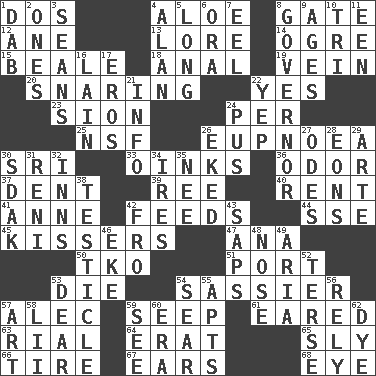 ACROSS 1. Two (Sp.) 4. Medicinal plant 8. Yard entry 12. One (Scot) 13. Old wives' tales, e.g. 14. Legendary monster 15. Calif. Air Force Base 18. Of or related to the anus 19. Distinctive style or manner 20. Catching in a trap 22. It is so 23. The Jewish people; Israel 24. For each 25. Science/research agcy. 26. Normal relaxed breathing 30. _ Lanka 33. Pig sounds 36. Aroma 37. Gouge 39. To sift 40. Monthly bill 41. Queen of England 1702-14 42. Gives food to 44. Compass dir. 45. Smoochers 47. Santa ___, CA 50. Ring climax 51. Sweet dark-red dessert wine 53. Pass on 54. More lively and spirited 57. Actor Baldwin 59. Ooze 61. Having ears or earlike features 63. Monetary unit of Yemen 64. Part of Q.E.F. 65. Secret 66. Hoop that covers a wheel 67. Hearing organs 68. Sight organ DOWN 1. Small moist lump or mass 2. Singles 3. Actors Connery and Penn 4. Actor Alda or Thicke 5. Having great length 6. Mouth or opening 7. Snakelike fish 8. Head of state? 9. Grows older 10. Three (prefix) 11. Car or cant ending 16. (Had) reclined 17. Greek god of love 21. Information 22. Slangy assent 24. Purulenc 26. Supplemented with great effort 27. Lyric poems 28. Immeasurably long periods of time 29. Johnson of "Laugh-In" 30. Neighbor of Neb. 31. Painter Guido (1575-1642) 32. Restaurants 34. Angers 35. Born 38. One of the two male reproductive glands 42. From 43. Plant excrements 46. Supplement with great effort 48. Sense of smell 49. Roberta Peters solo 52. Laconic 53. Letter starter 54. Singe 55. Flats, for short 56. Trust 57. Nonscientific branch of learning 58. Cards in a Roman deck? 59. Perceive with the eye 60. Epoch 62. Color