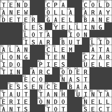 ACROSS 1. Look after 5. Accounting whiz (abbr.) 8. Lacking warmth 12. Afresh 13. Water jar 15. Like ___ of sunshine 16. Prevent from occurring 18. Highlander 19. Object of repulsion 20. French article 22. Crying or shouting loudly 24. Globular water bottle used in Asia 26. Electrically charged atom 27. Austrian river, tributary to the Danube 28. Yet 29. Flaplike covering 32. ____ Jay Lerner 35. Clement's nick name 37. "One Day ___ Time" 38. Protracted 39. Nine, plus one 40. Russian ruler of old 41. Wedding promise 42. Sliced desserts 43. Ubangi River tributary 44. Shallow baking pan 45. Curve 46. River in Europe 49. Environmental prefix 50. Political cartoonist Thomas 51. Gist 55. Sound made by sheep 56. Pulled tight 57. Hyperbolic tangent 59. National forest in Provo, Utah 63. 4th largest of the Great Lakes 64. Southwest Nigerian state 65. 1994 drama film starring Jodie Foster 66. Pismires 67. Small child 68. Religious group DOWN 1. Small boy 2. Compass dir. 3. Fish or hair follower 4. Home 5. Gear tooth 6. Romp 7. Toward shelter 8. Small house or cottage 9. NW Algerian seaport 10. Austrian-born American filmmaker Fritz 11. Color 14. Plant genus of onion and garlic 17. Vintage cars 21. R.R. building 23. Car dealer's back yard 25. Northern region 28. Gillaume's butler role 29. Goldbrick 30. Slanted text style (abbr.) 31. Have the gumption 32. Set down 33. Farming town in central California 34. At once, immediately (arch.) 36. Area sheltered from the wind 40. Window treatments 42. Right away 45. Adept person 47. Small moist lump or mass 48. He sold his birthright 49. _____ Park, CO 51. Merit 52. Set of matching outer garments 53. Patter 54. Inside; within (prefix) 56. Afternoon social gathering 58. Being at a high temperature 60. Born 61. Affectionate concern, for short 62. The first octave above the treble staff